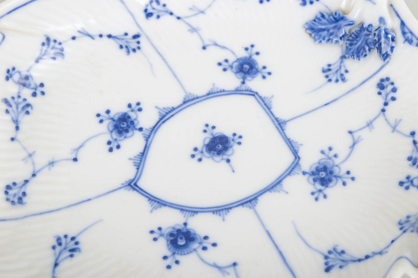 Sjældent antikt bladformet porcelænsfad med integreret hank, dekoreret i håndmalet koboltblåt underglasur i det klassiske Musselmalet Riflet mønster. Fadet har en markant skulpturel form med bølget rand og opdelt spejl, rigt udsmykket med blomster- og rankemotiver. Malerens nummer 15 er registreret som dekoratør. Modellen er udført i begyndelsen af 1800-tallet og repræsenterer et tidligt og usædvanligt eksempel på Royal Copenhagens formgivning.