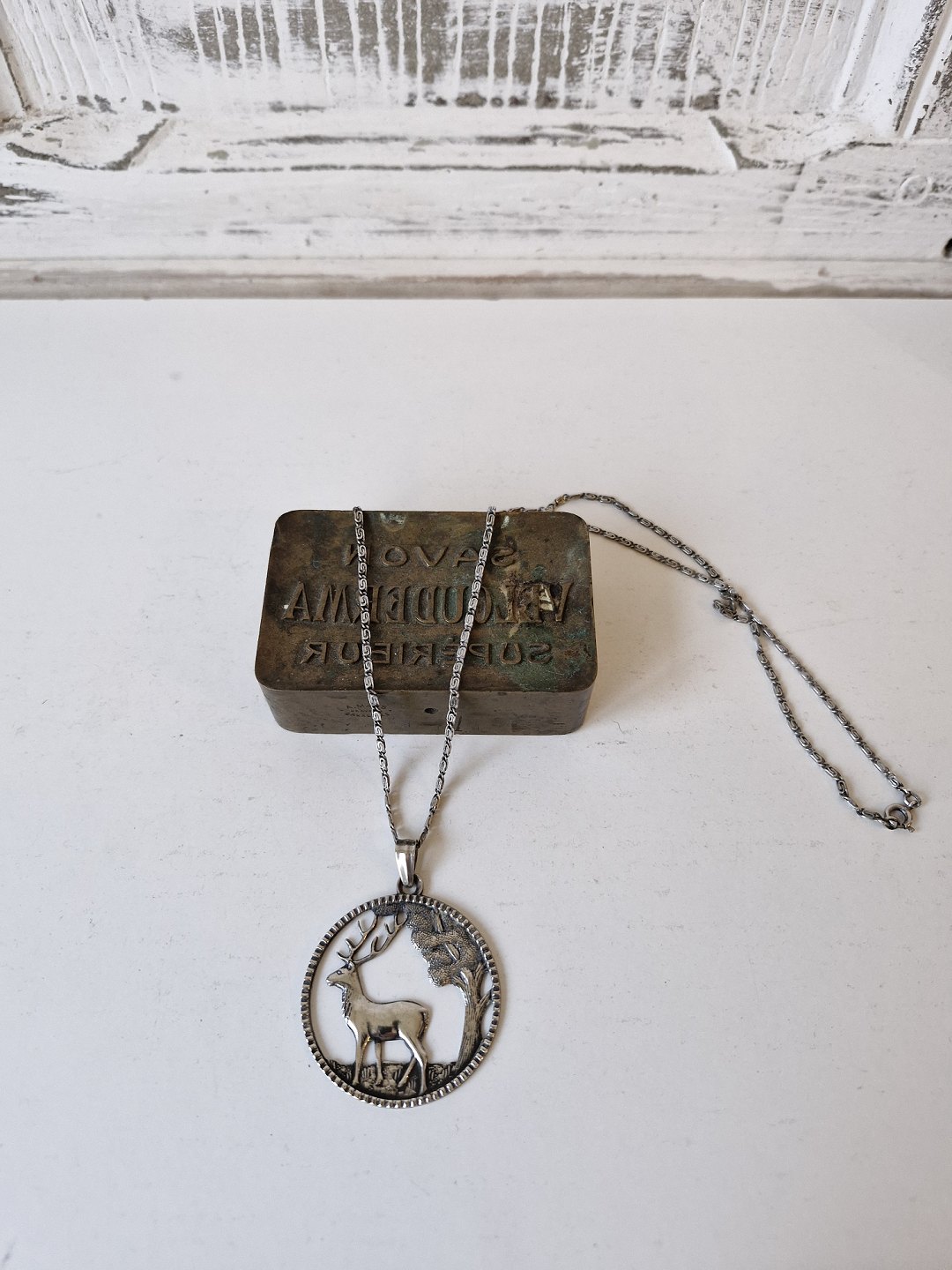 Halskæde og vedhæng i sølv, vedhænget er udformet som skovparti med krondyr
