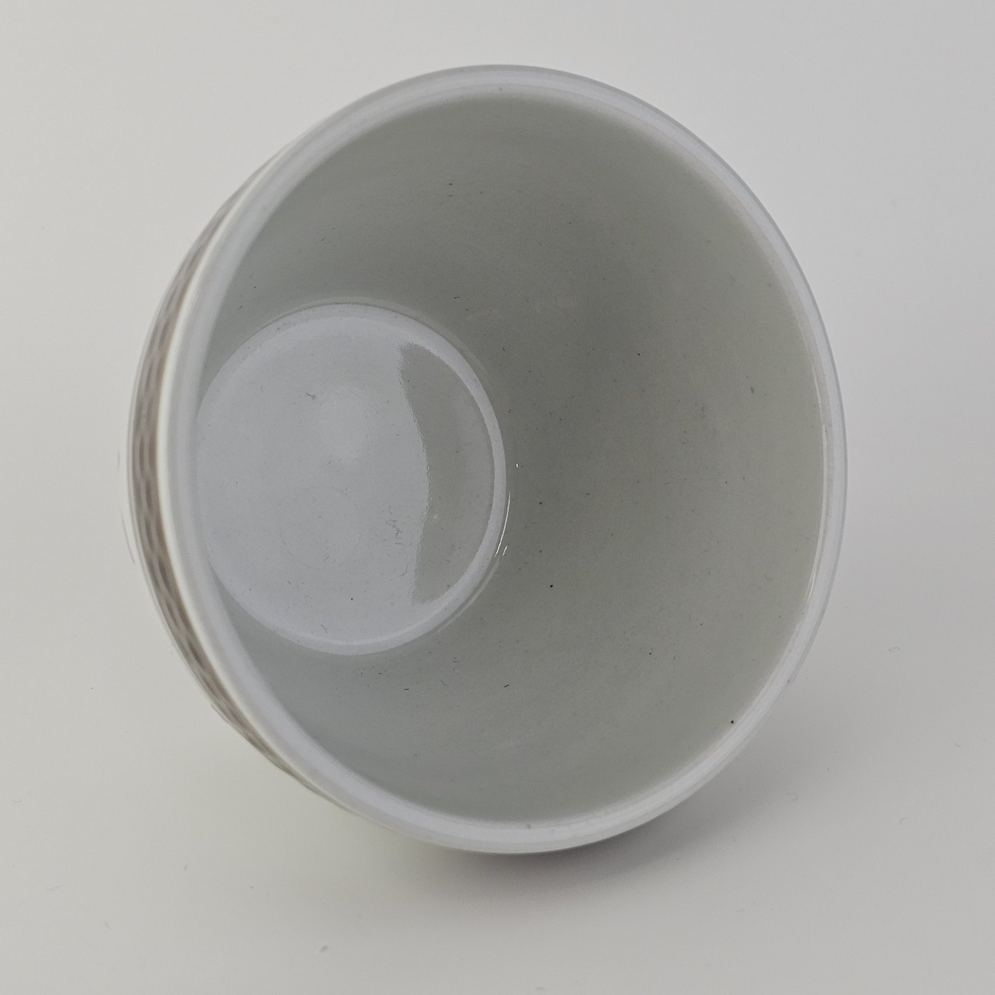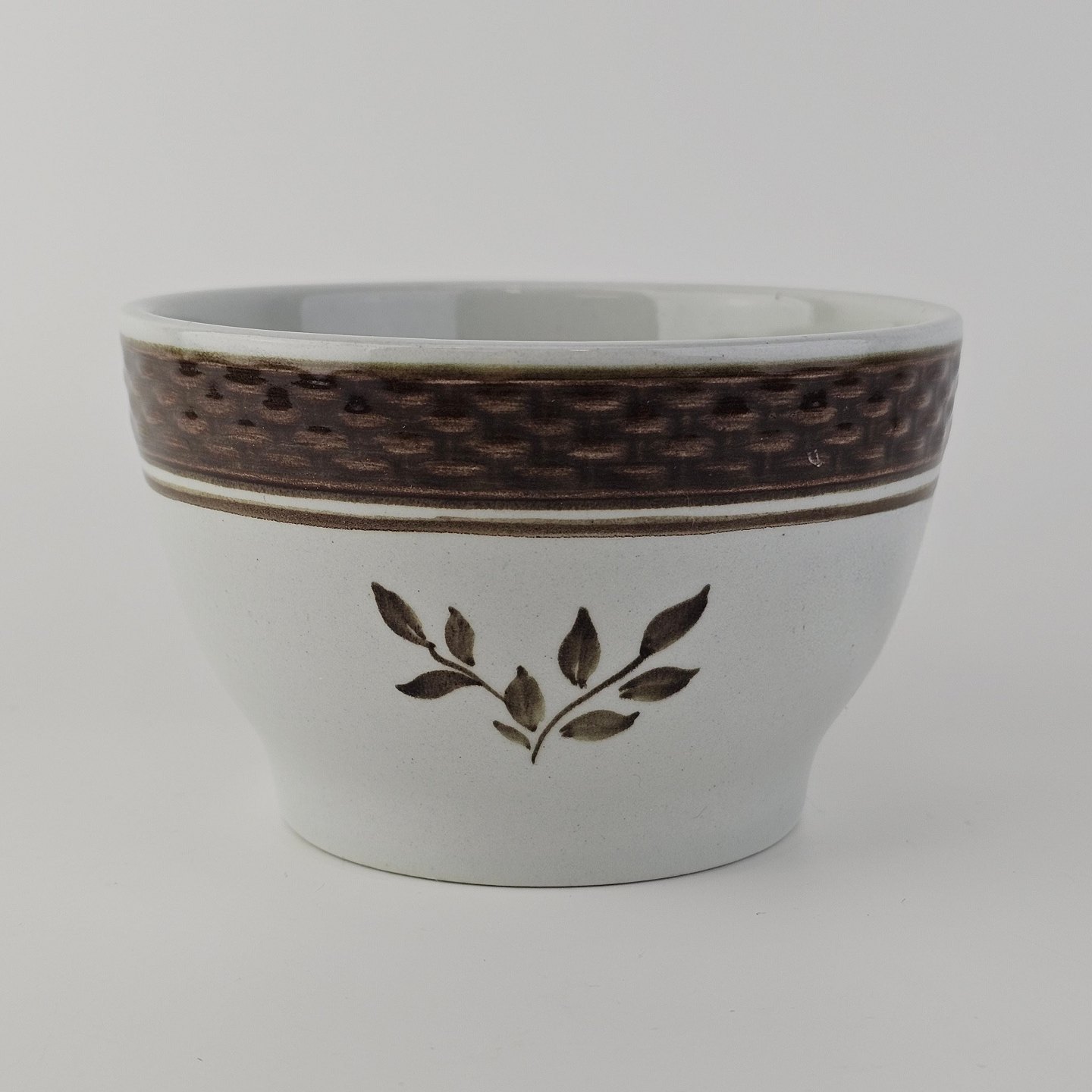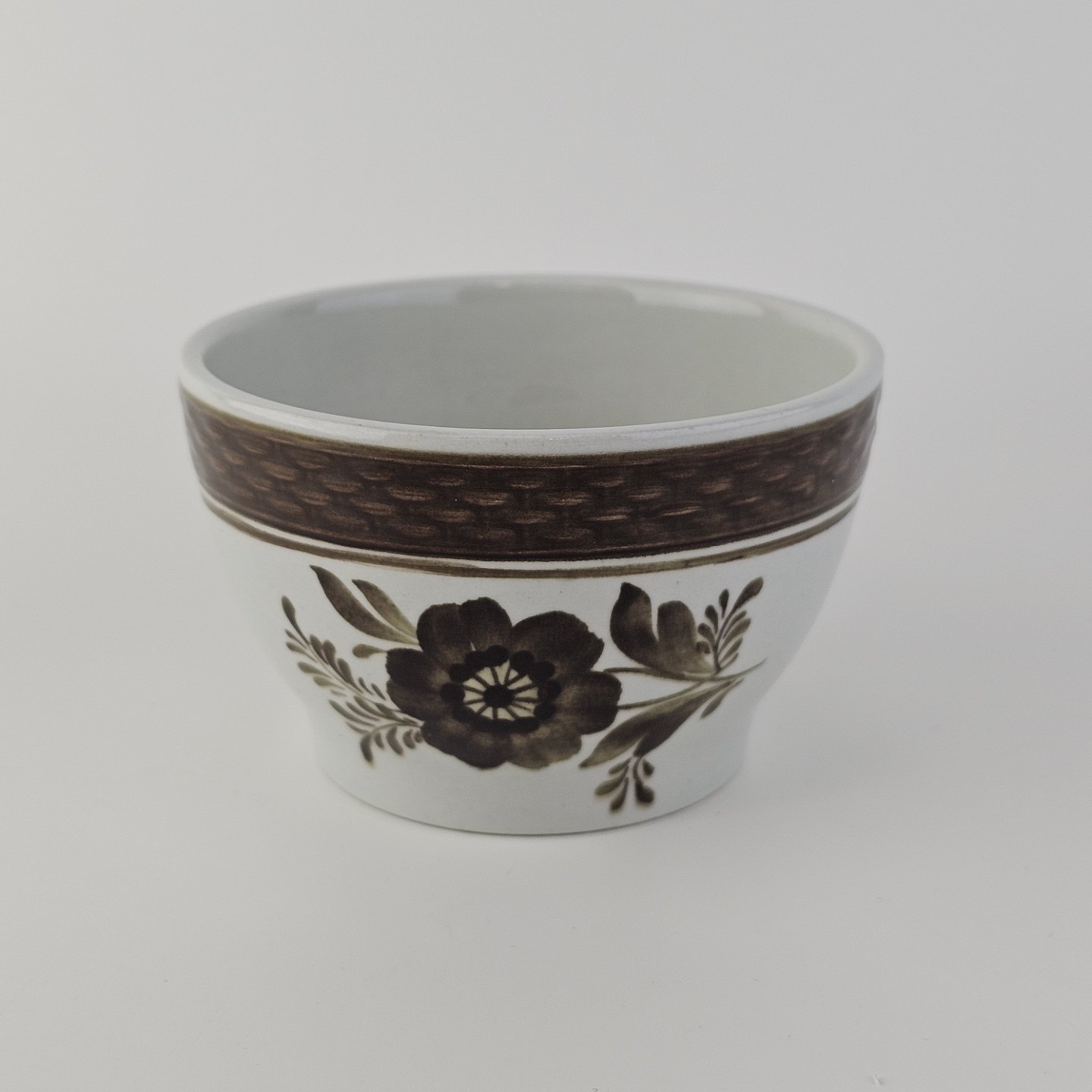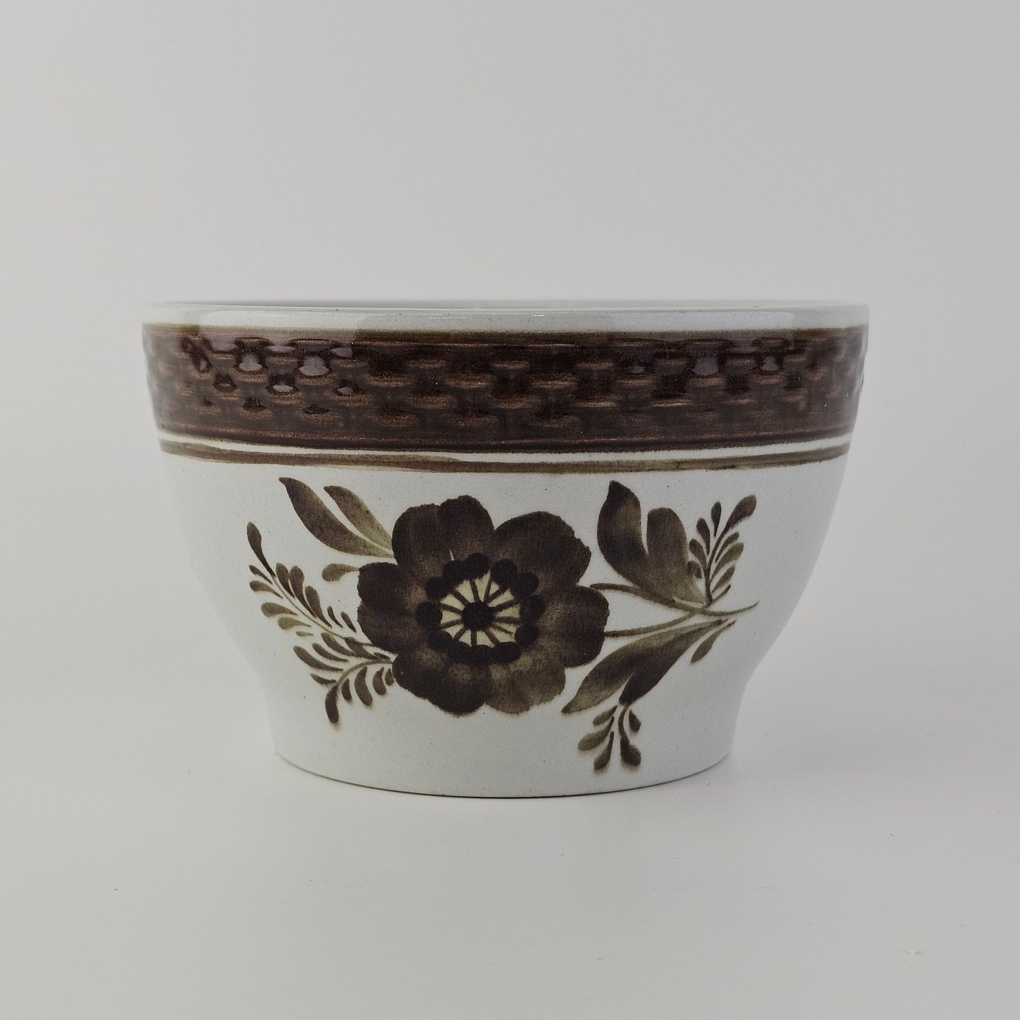 Fajancestellet med flettet kant og dekoration af brune blomster på lys baggrund med brun kant