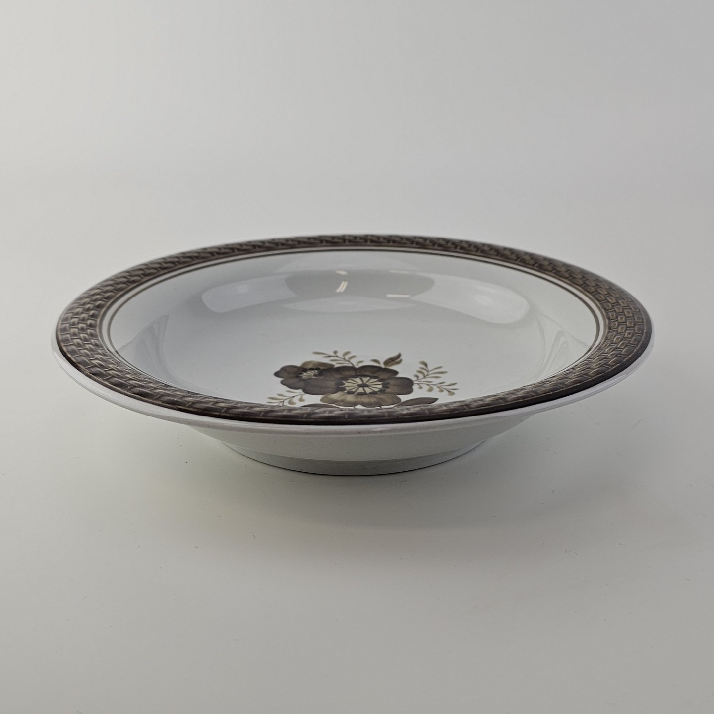Fajancestellet med flettet kant og dekoration af brune blomster på lys baggrund med brun kant