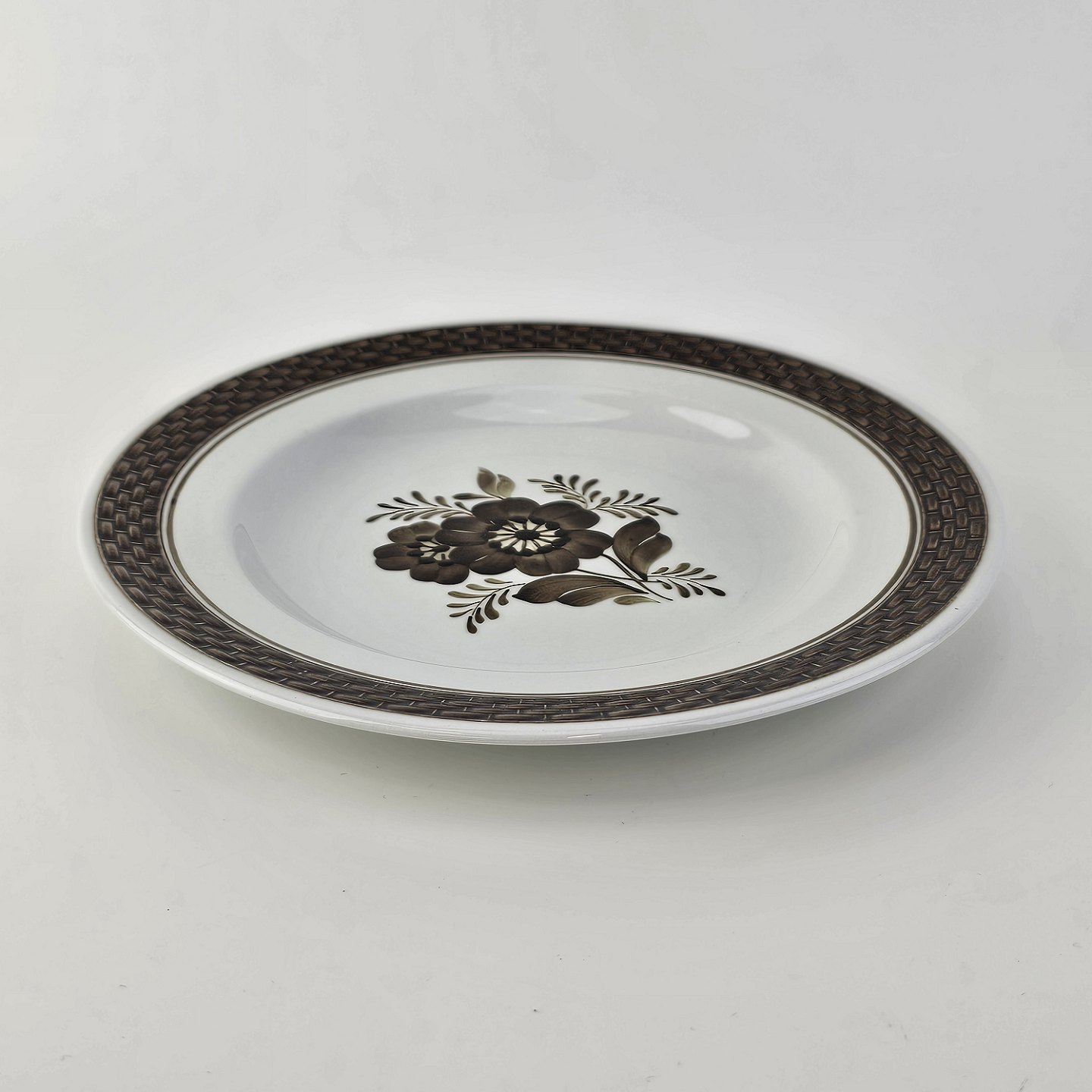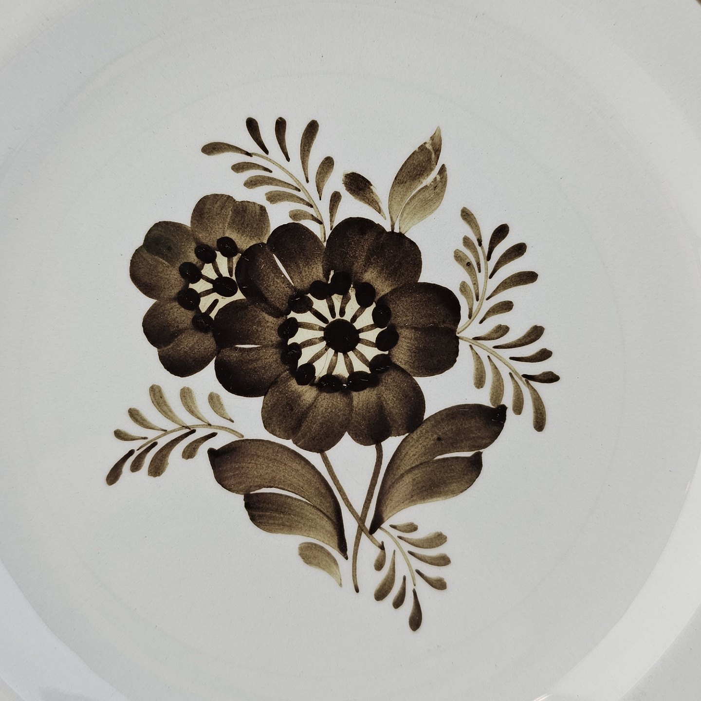 Fajancestellet med flettet kant og dekoration af brune blomster på lys baggrund med brun kant