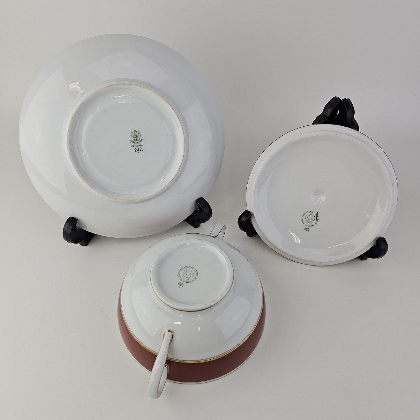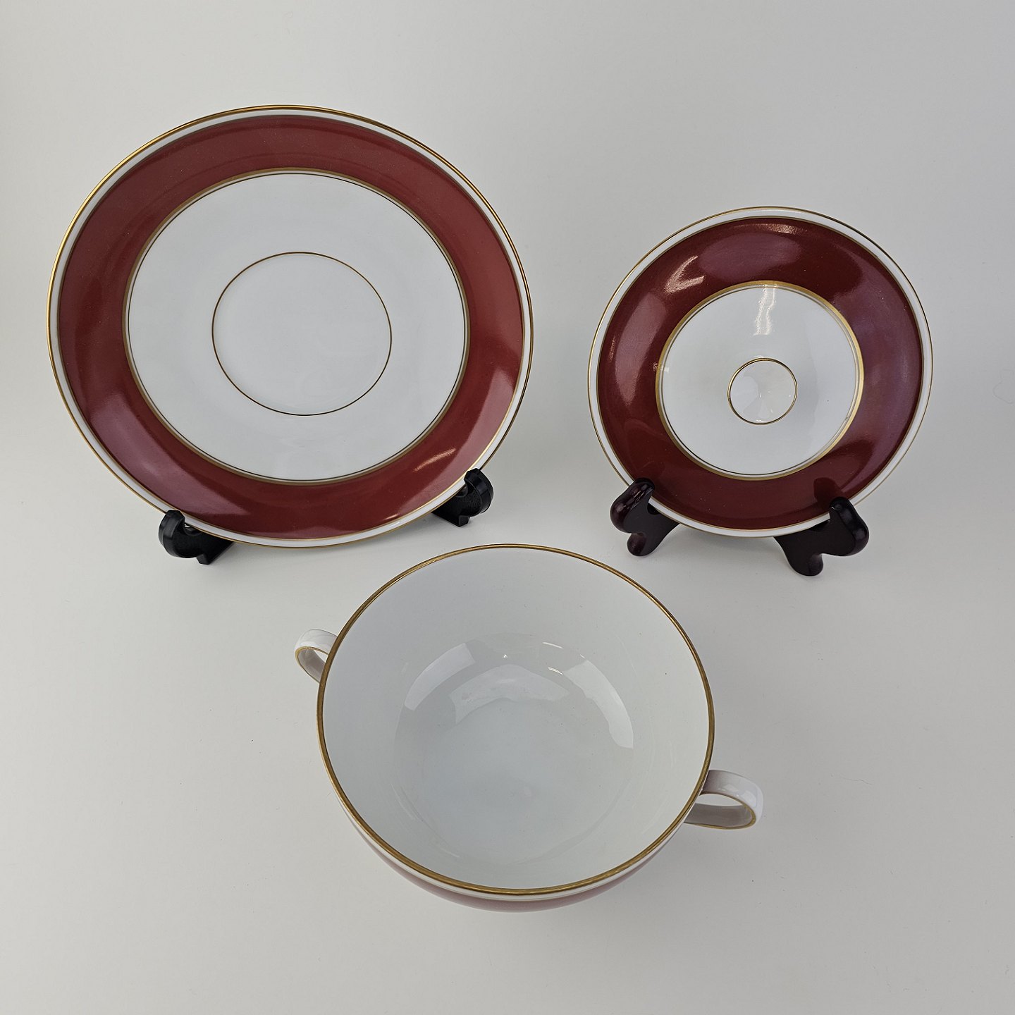 Service i porcelæn med rød bort og guldkant
