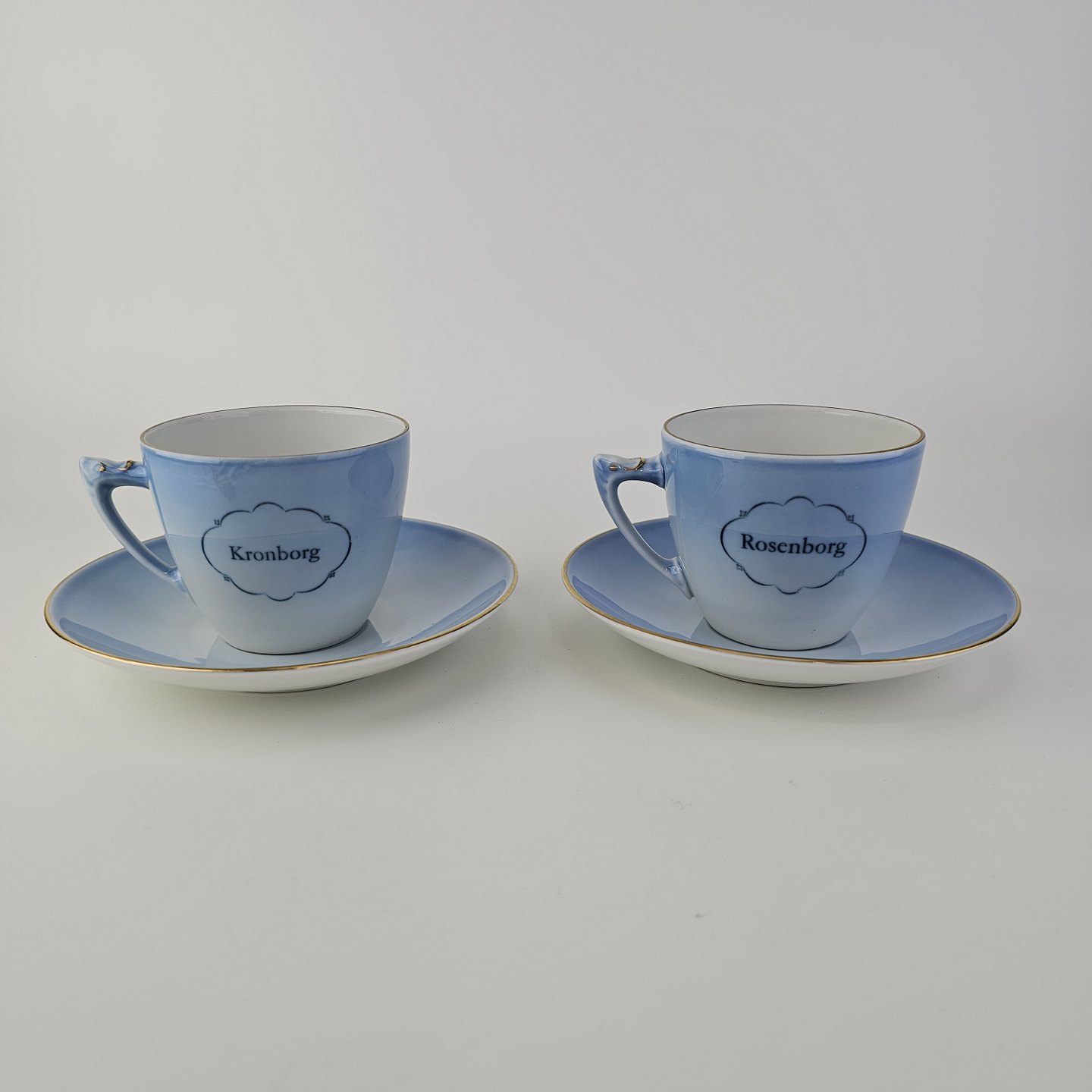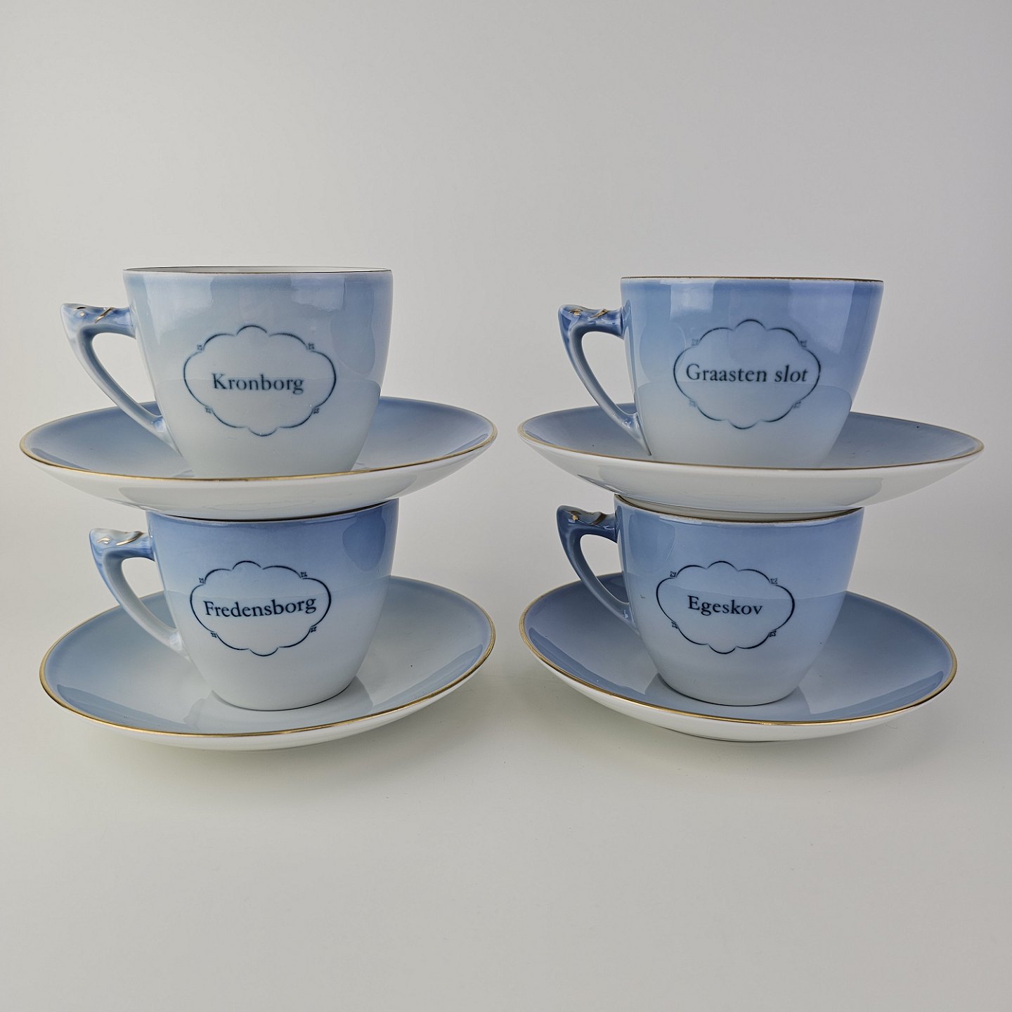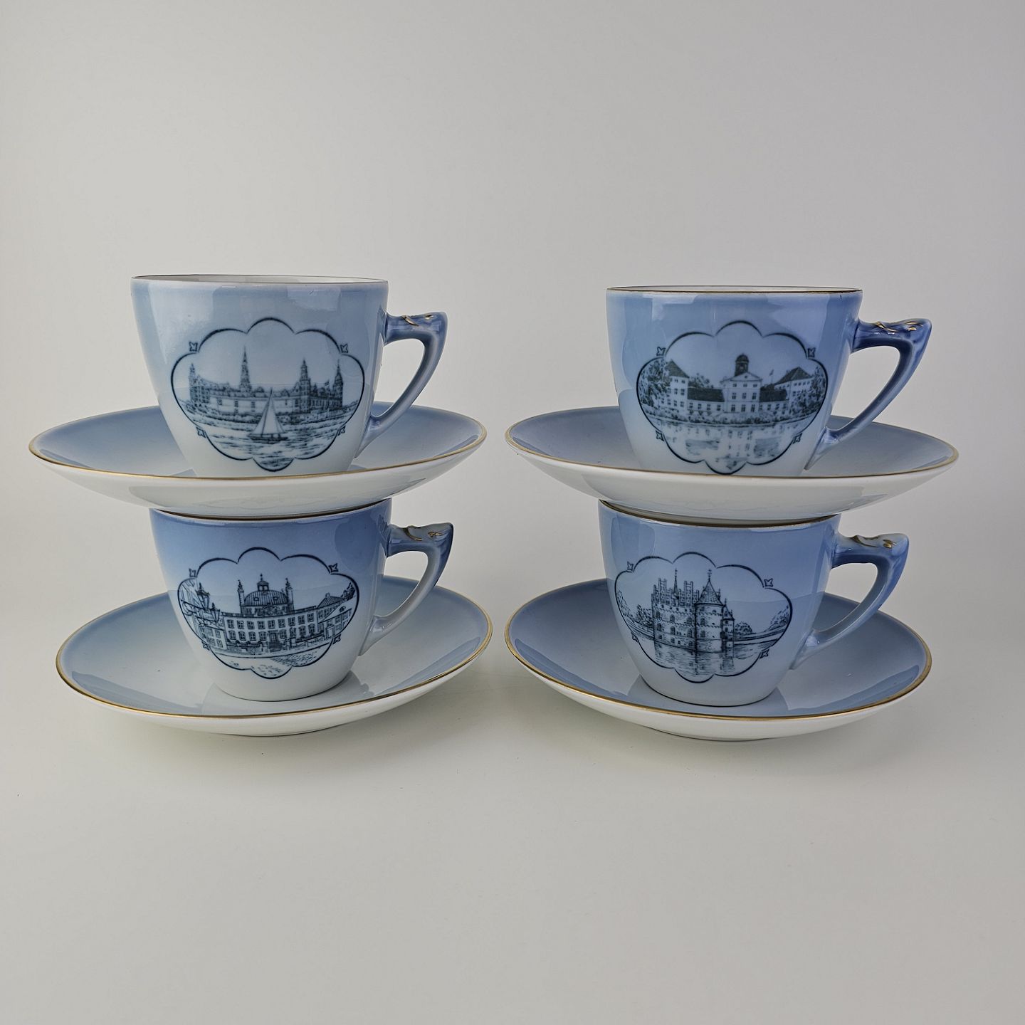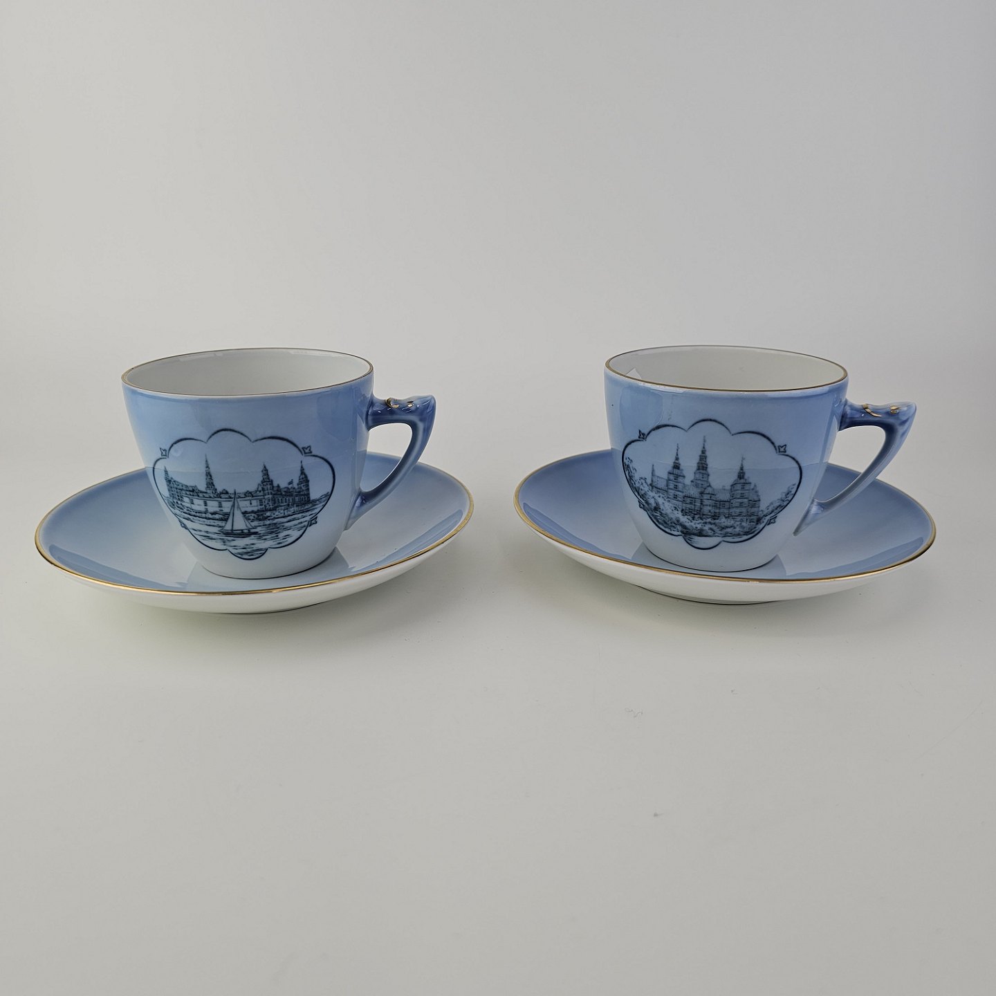 Kopper med underkopper i blåmalet porcelæn dekoreret med motiver af danske slotte og guldkant