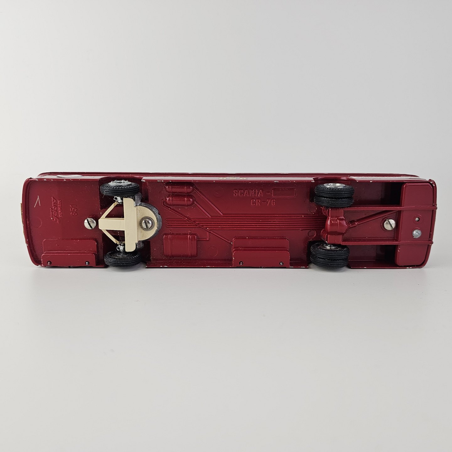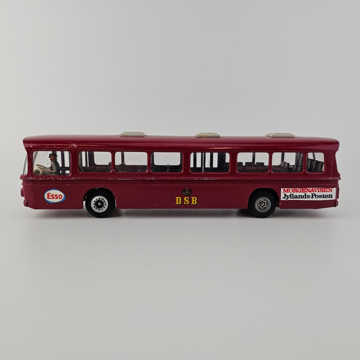 Legetøjsbil. Rødmalet DSB bus, Scania CR-76 med reklamer, chauffør og en baglåge, der kan åbnes