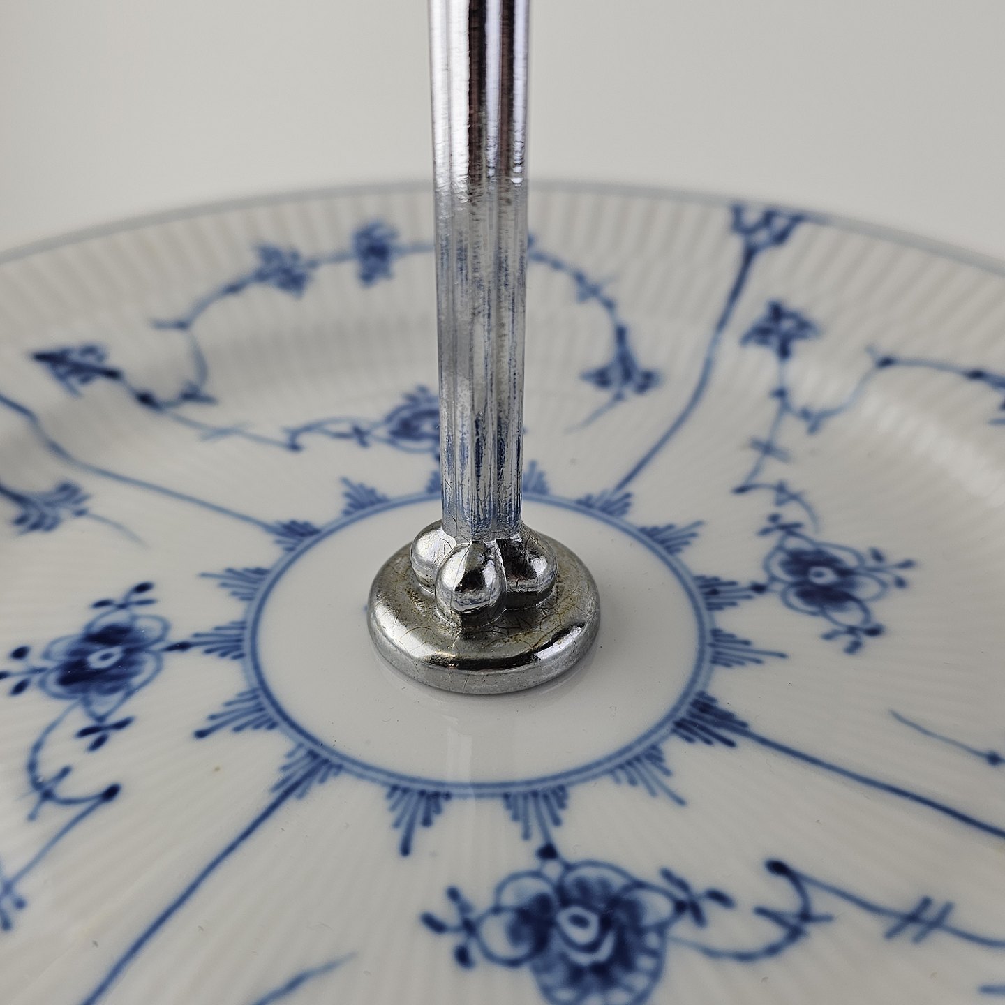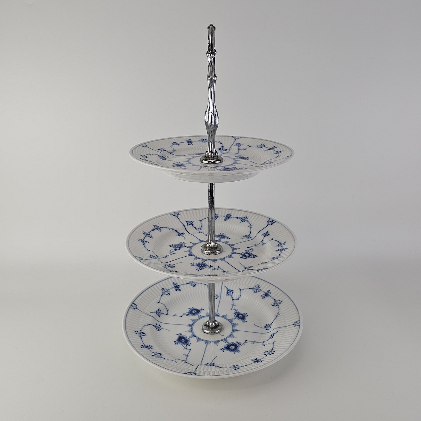 Kageopsats i tre lag i kongeligt porcelæn fra stellet Musselmalet riflet.
