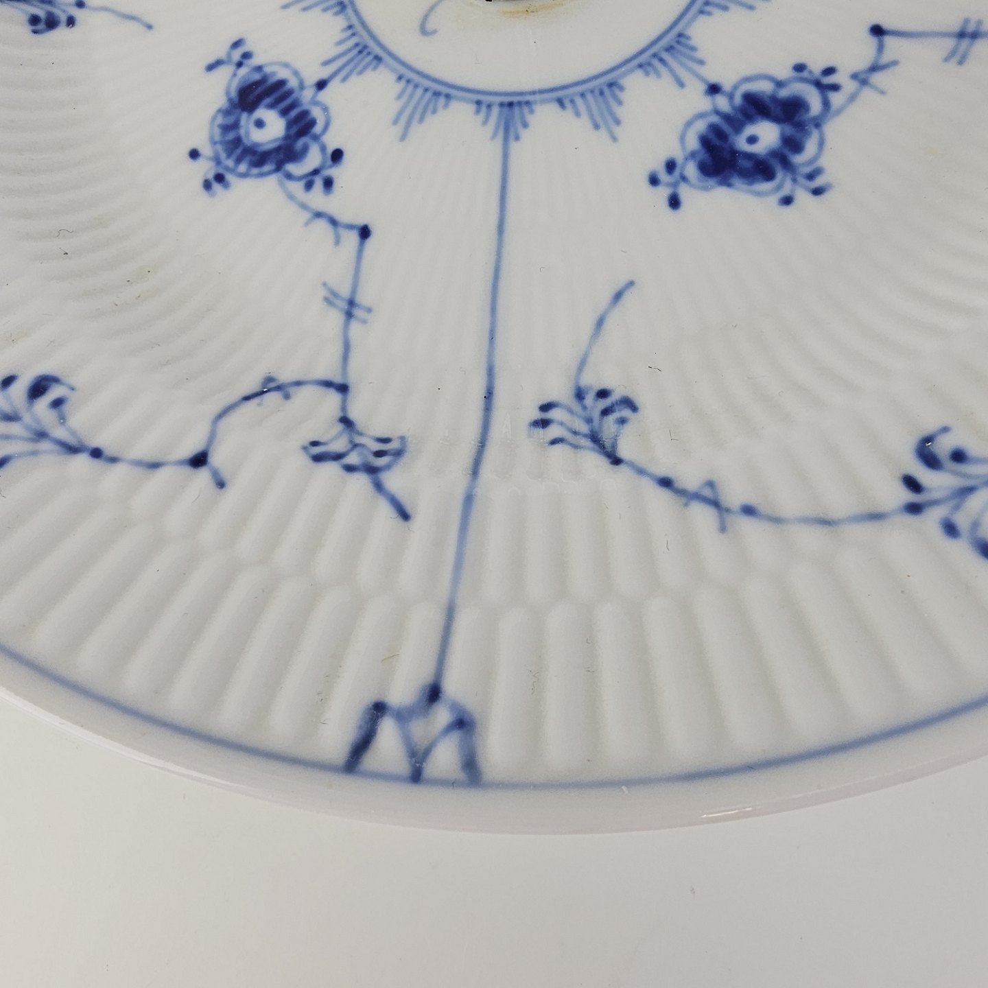 Musselmalet er af kongeligt hvidt porcelæn, dekoreret med rifler og mønster af blå ranker og blomster.