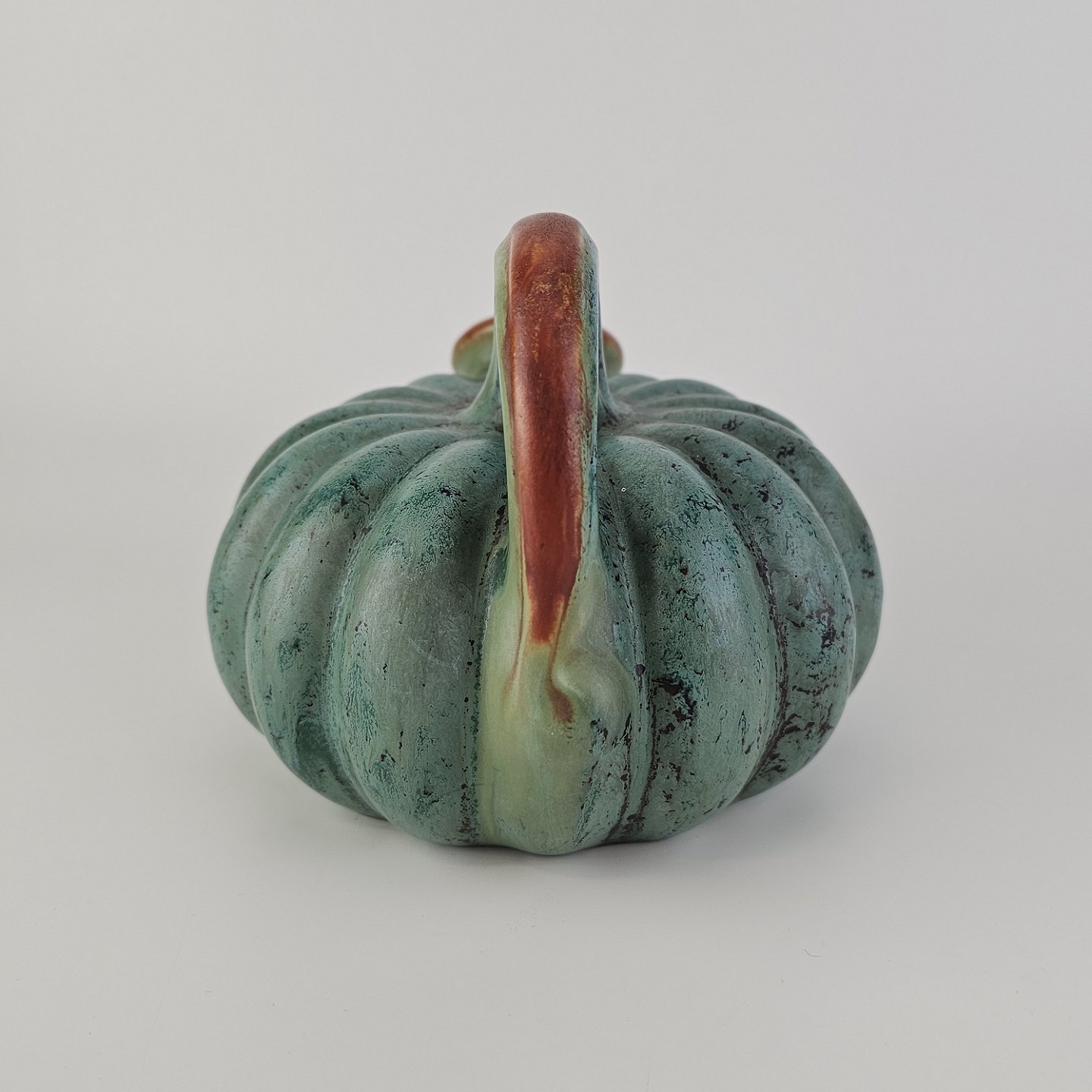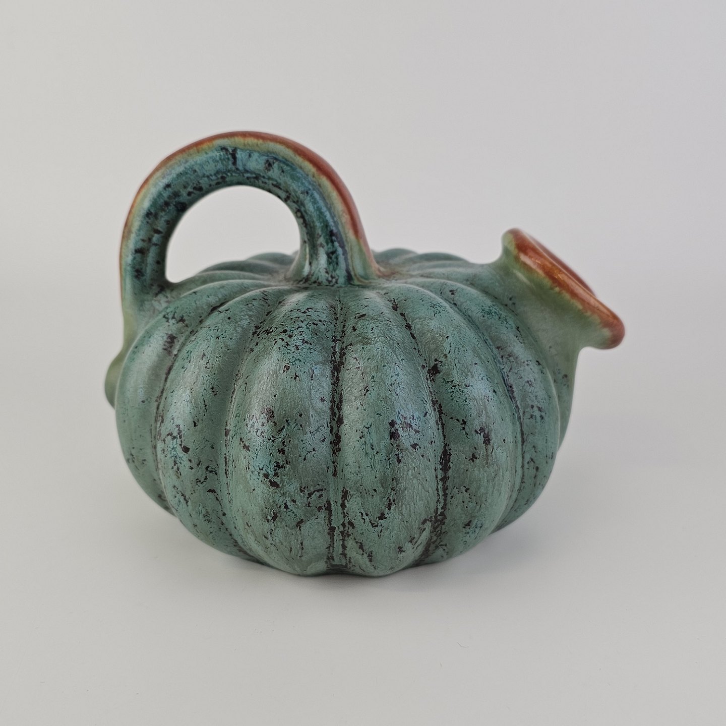 Kande i keramik med form som et græskar og grøn og brun glasering
