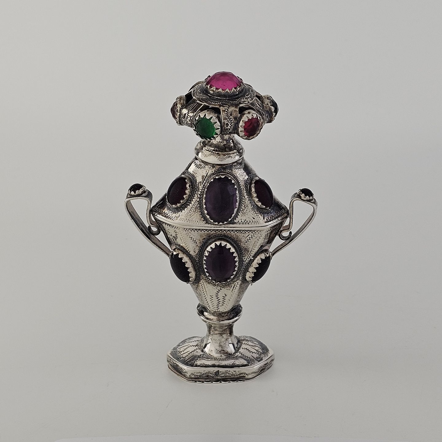 Hovedvandsæg i sølv dekoreret med forskellige smykkesten. Indgraveret under bunden med et hjerte, initialer og årstallet 1955
