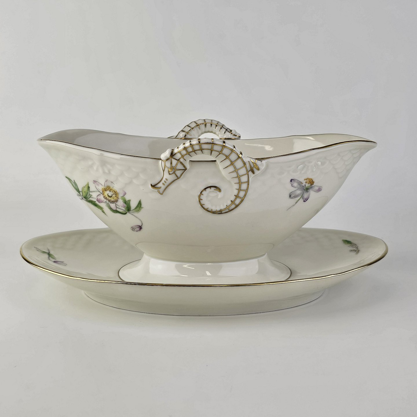 Frigga Anemone er cremefarvet porcelæn dekoreret med motiv af anemoner og bøgeløv med guldkant