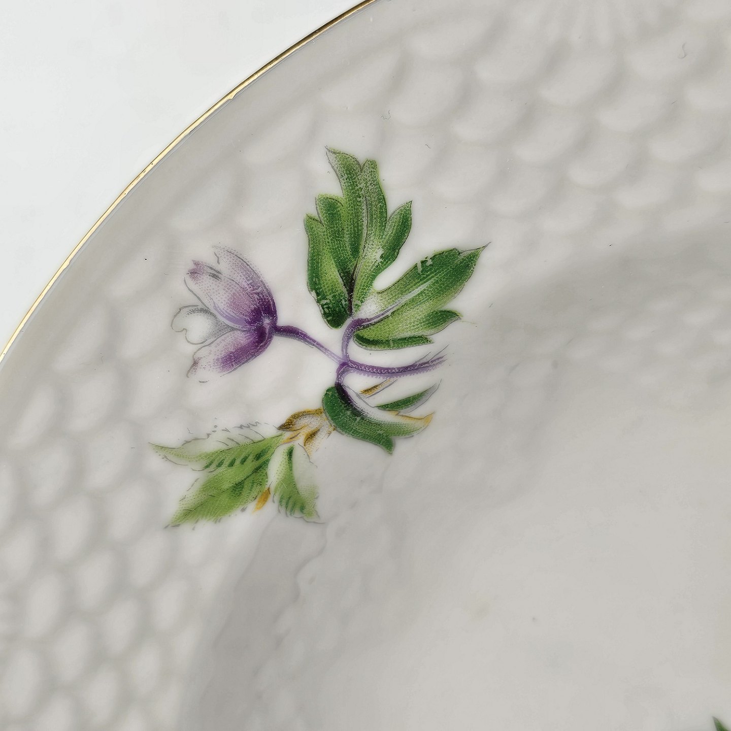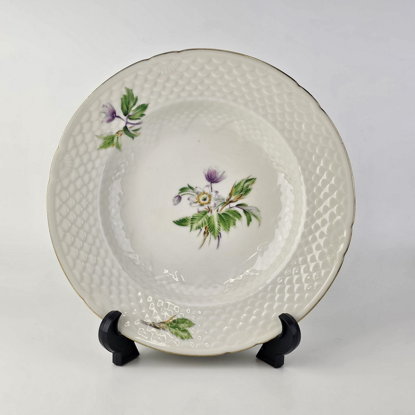 Frigga Anemone er cremefarvet porcelæn dekoreret med motiv af anemoner og bøgeløv med guldkant