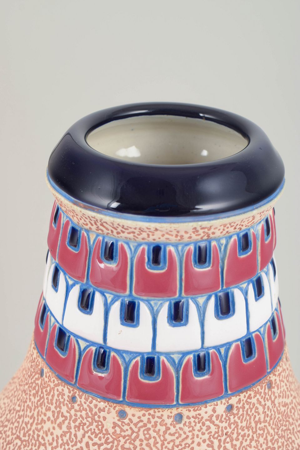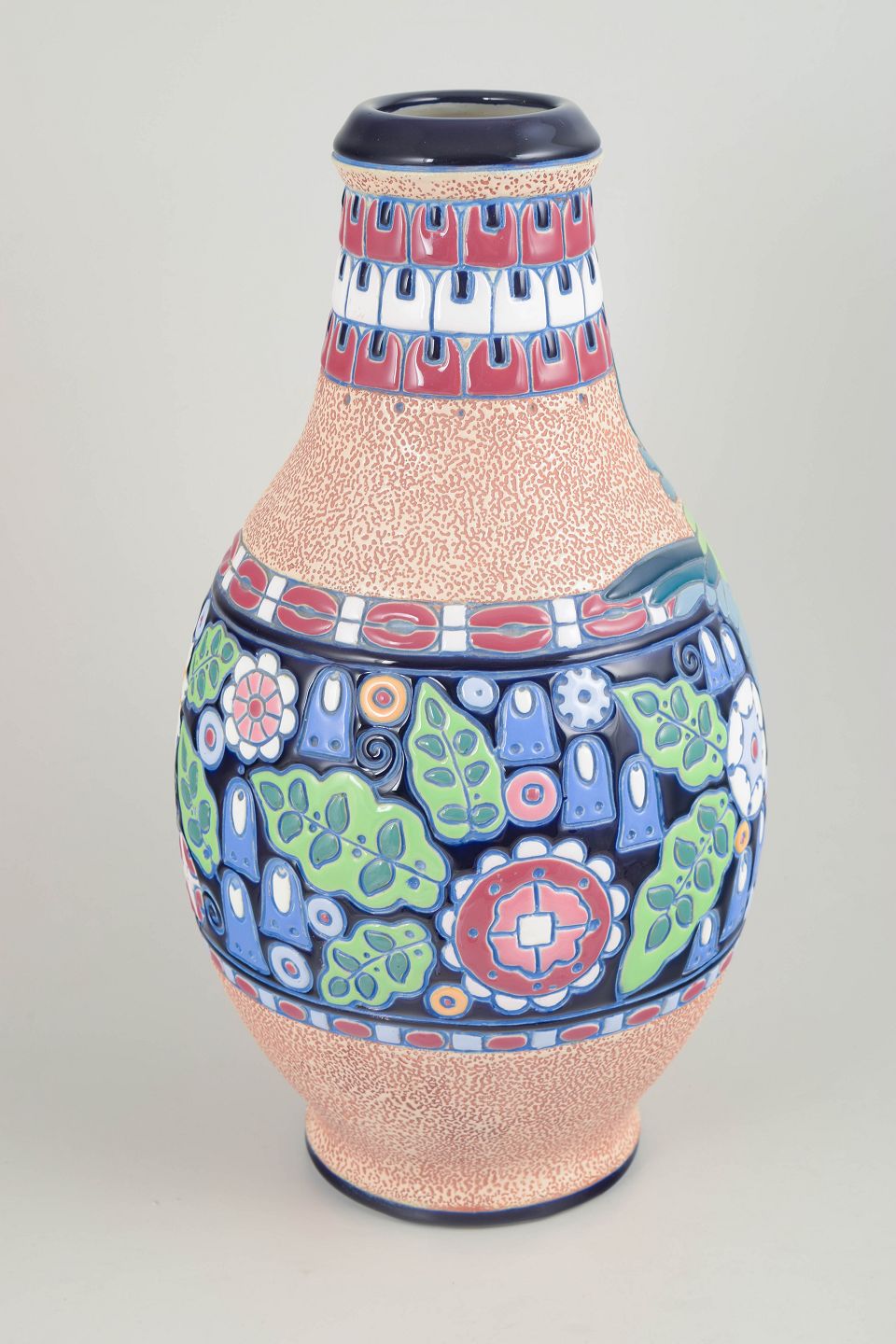 Tjekkoslovakisk kunstkeramik fra 1930’erne var ofte præget af en syntese mellem Art Deco og folkelig ornamentik, hvor stiliserede dyre- og plantemotiver kombineres med geometriske mønstre i kraftige farver. Emaljedekorationen gav mulighed for klare kontraster og høj farvemætning, og store Amphora vaser som denne fungerede som markante interiørobjekter i tidens borgerlige hjem.