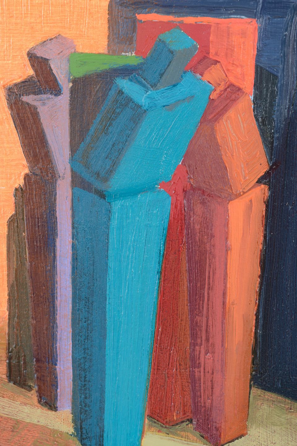 Kubistisk komposition med stiliserede, arkitektoniske figurer i klare farvefelter, udført i olie på træplade og signeret.