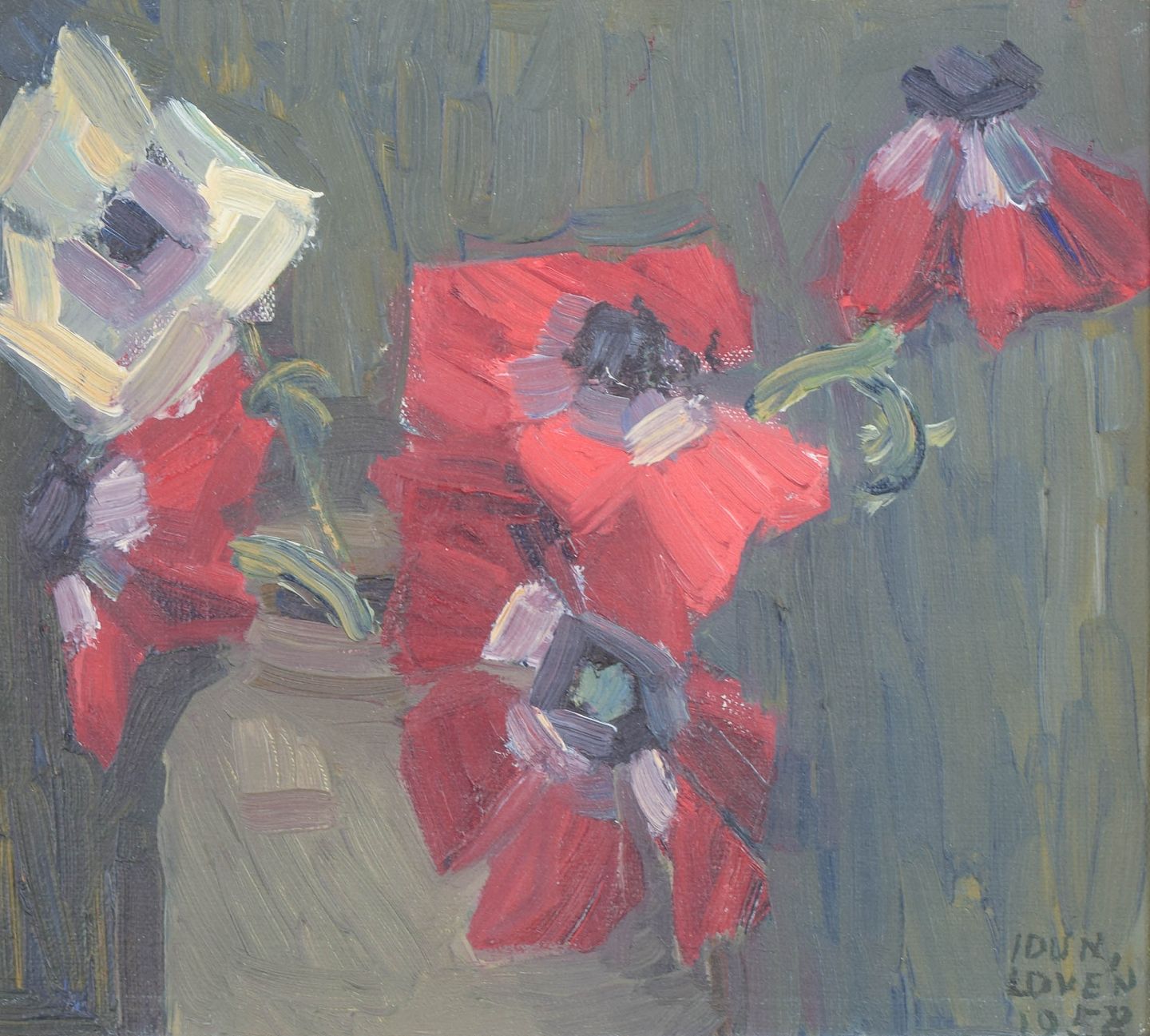 Blomstermotiv udført i et frit og malerisk formsprog med tydelige penselstrøg og en afdæmpet baggrund, der fremhæver de røde og lyse blomsterformer. Signeret og dateret 1958.