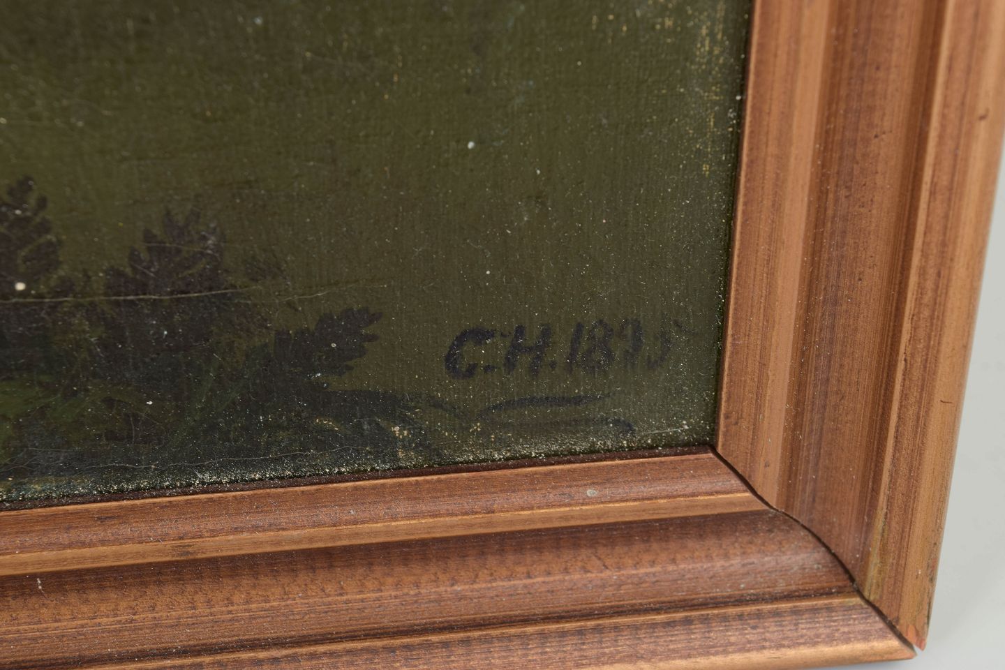 Landskabsmotiv fra Dyrehaven med sø, træer og hjorte i et stemningsfuldt skumringslys, udført som oliemaleri på lærred og signeret nederst til højre.
