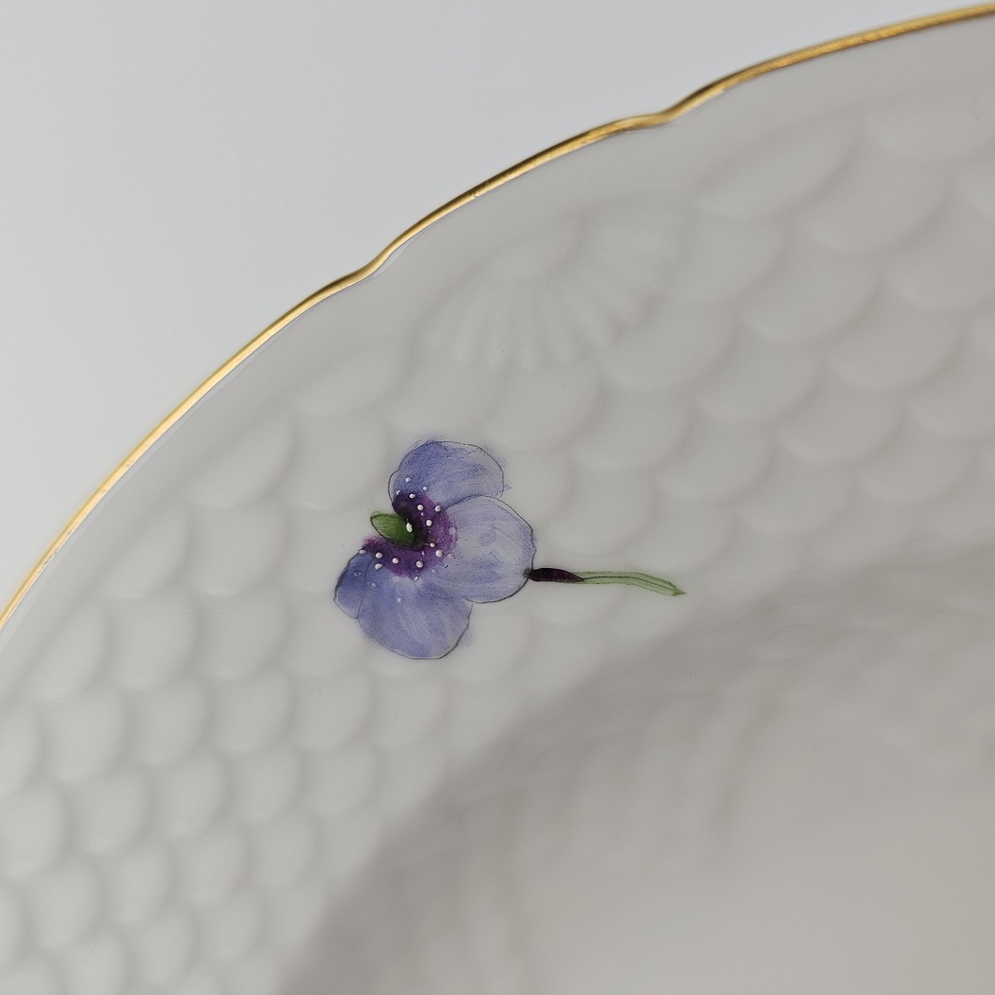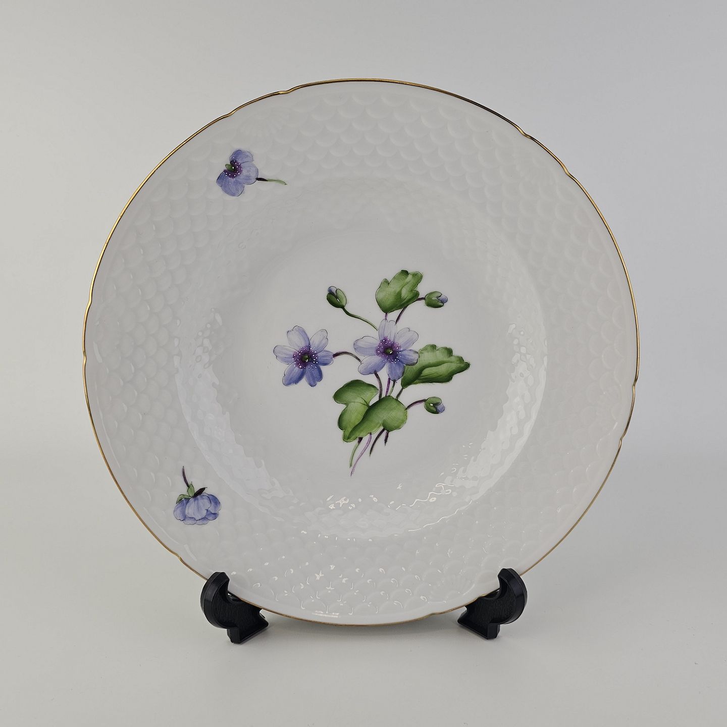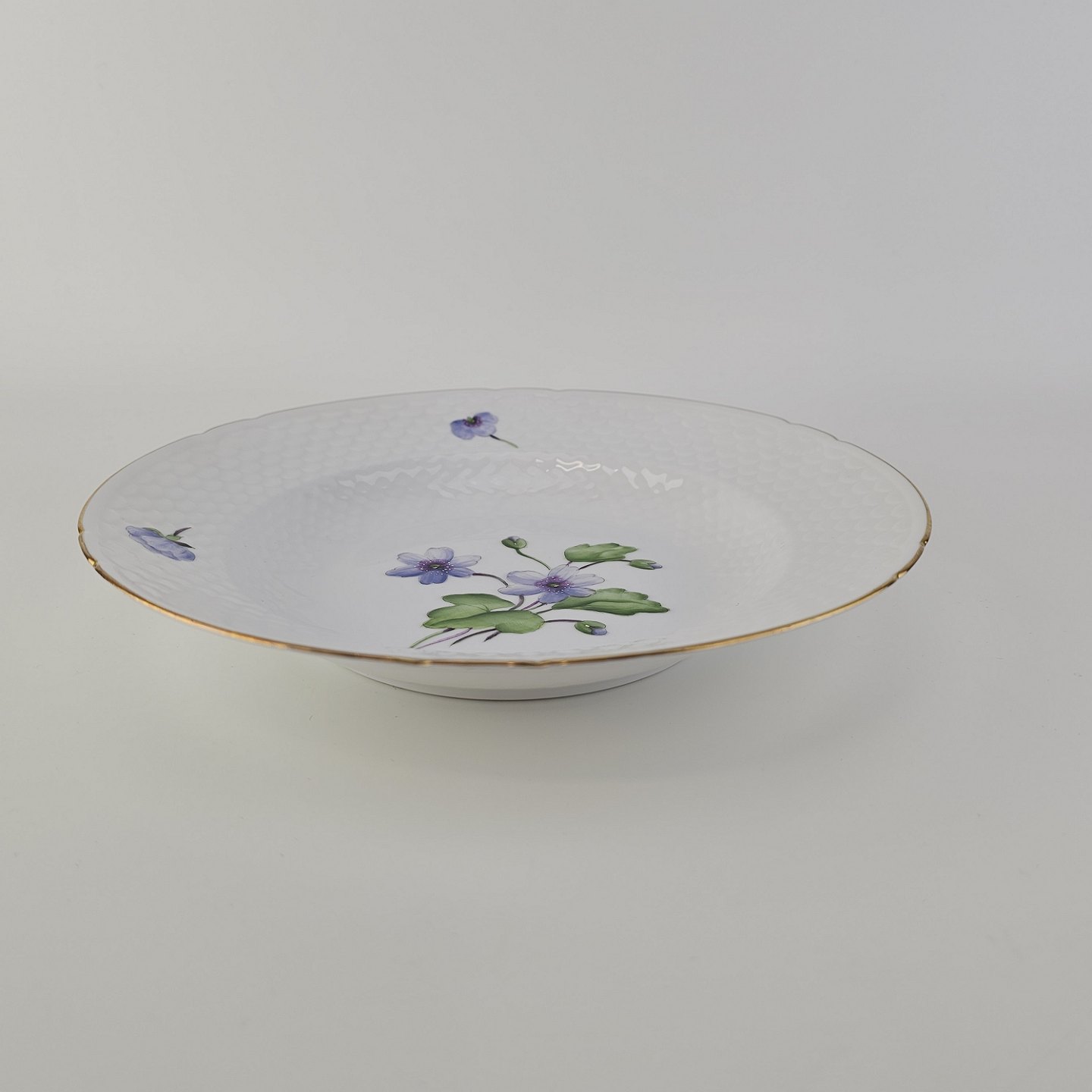 Antonius er af hvidt porcelæn med skælform dekoreret med håndmalede blå anemoner og guldkant. Også kendt under navnet Blå Anemone.