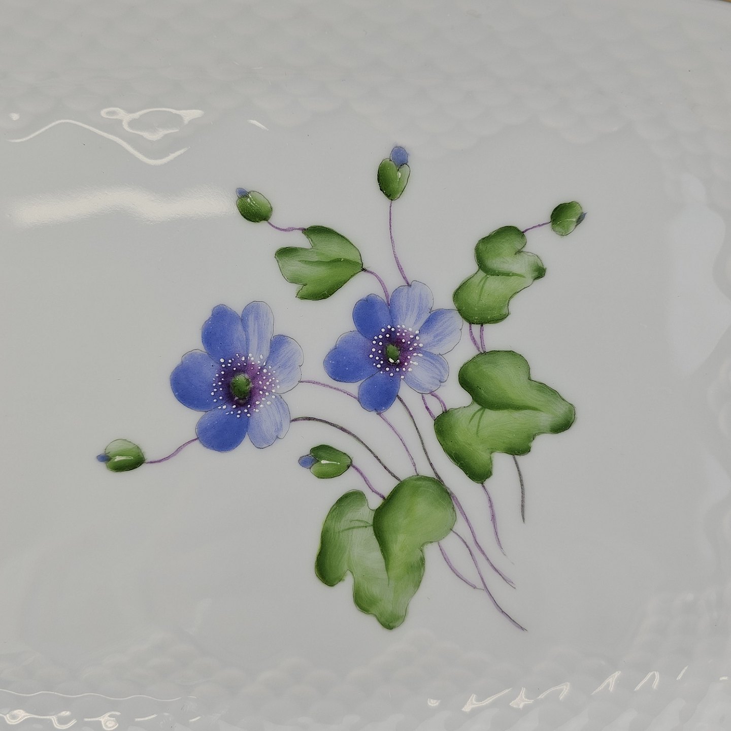 Antonius er af hvidt porcelæn med skælform dekoreret med håndmalede blå anemoner og guldkant. Også kendt under navnet Blå Anemone.