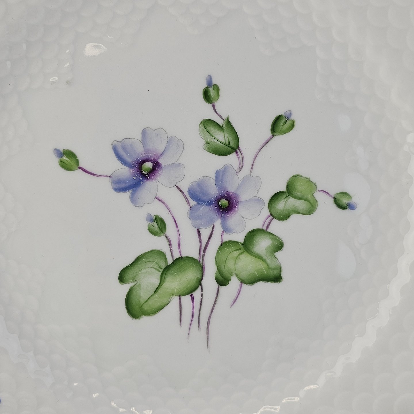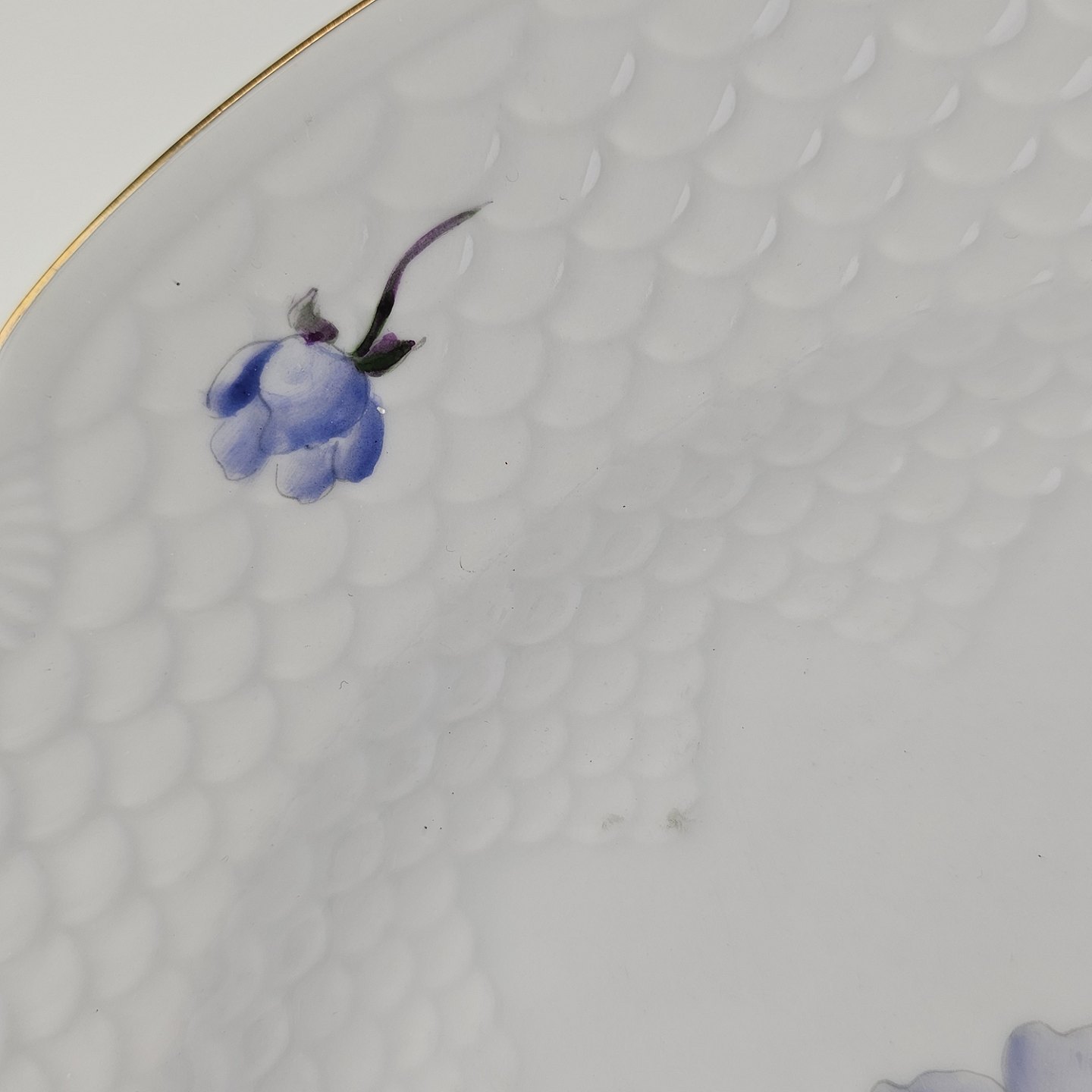 Antonius er af hvidt porcelæn med skælform dekoreret med håndmalede blå anemoner og guldkant. Også kendt under navnet Blå Anemone.