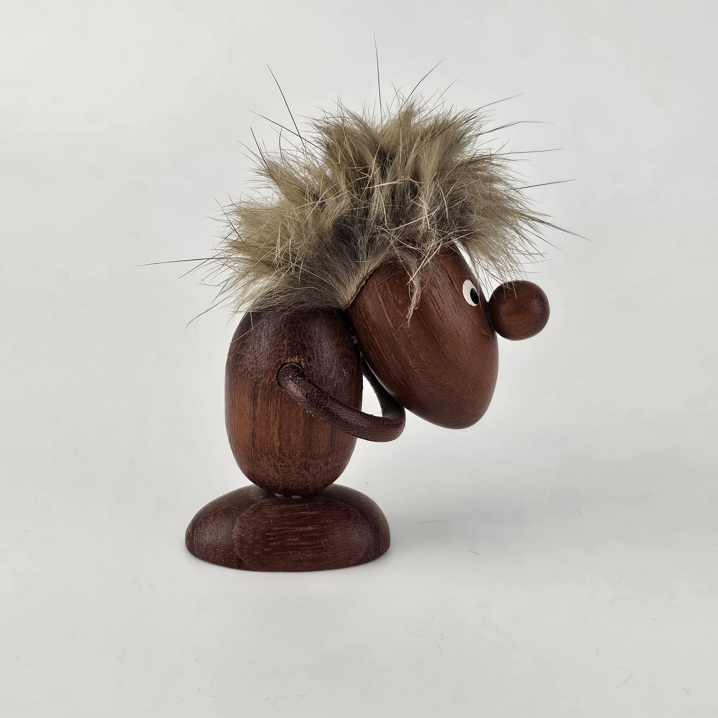 Håndskåret figur af teak med støvet blond hår og arme af læder. Fra 1960'erne