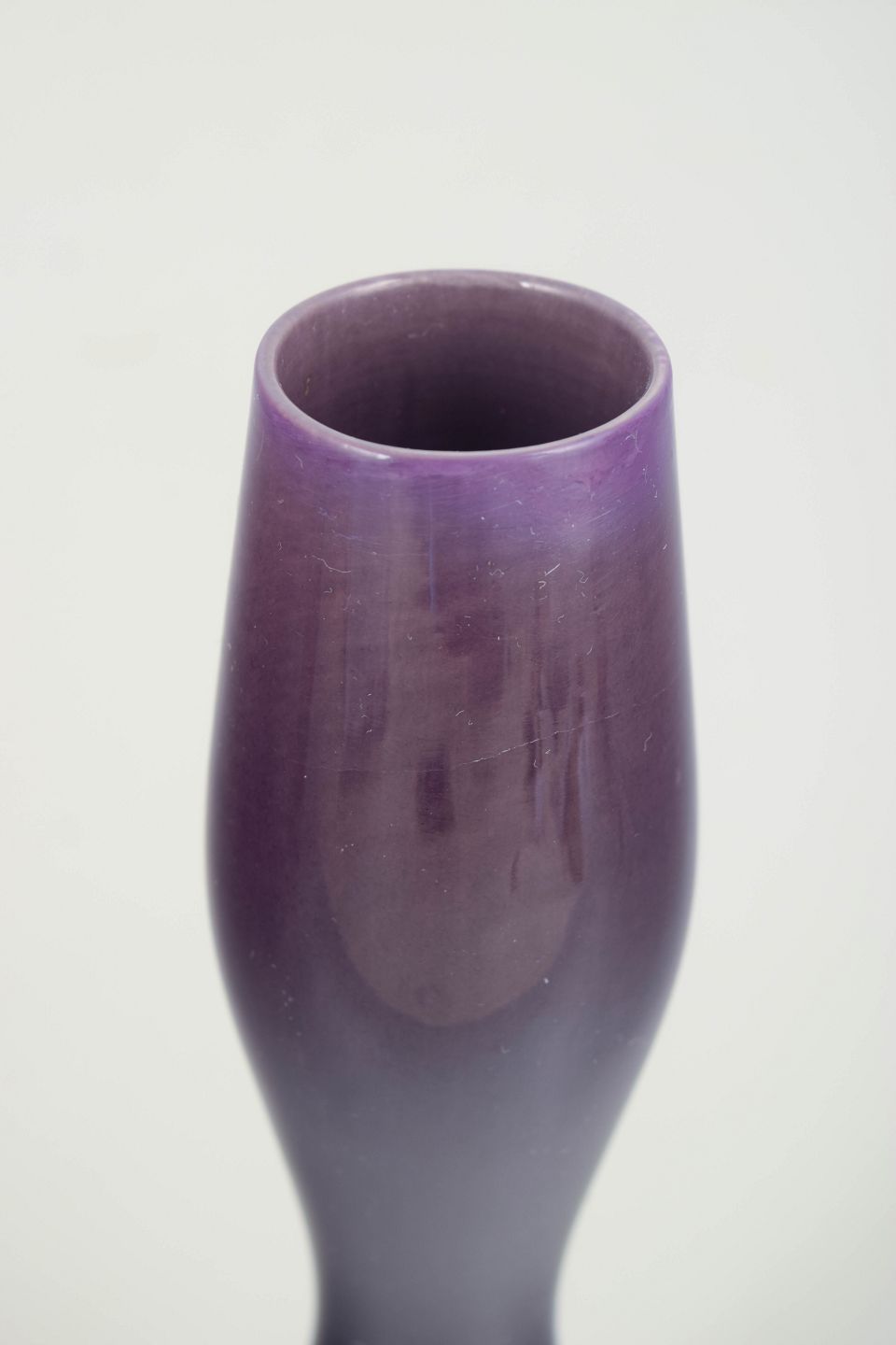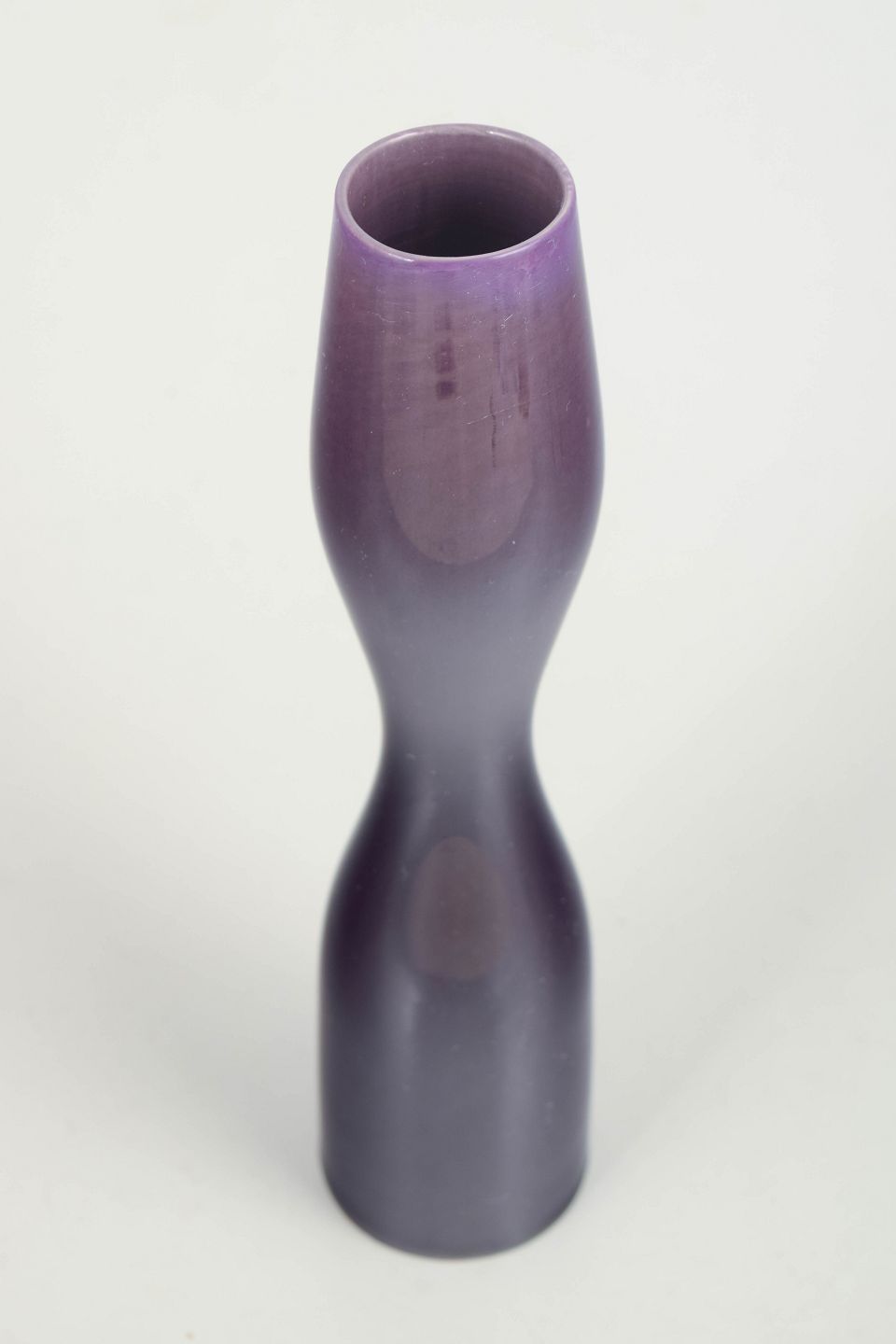 Slank, skulpturel vase i stentøj med dyb lilla glasur og blødt indsnævret midterparti. Modellen er karakteristisk for Stålhånes arbejde i midten af det 20. århundrede, hvor enkle, arkitektoniske former kombineres med raffinerede glasurer.