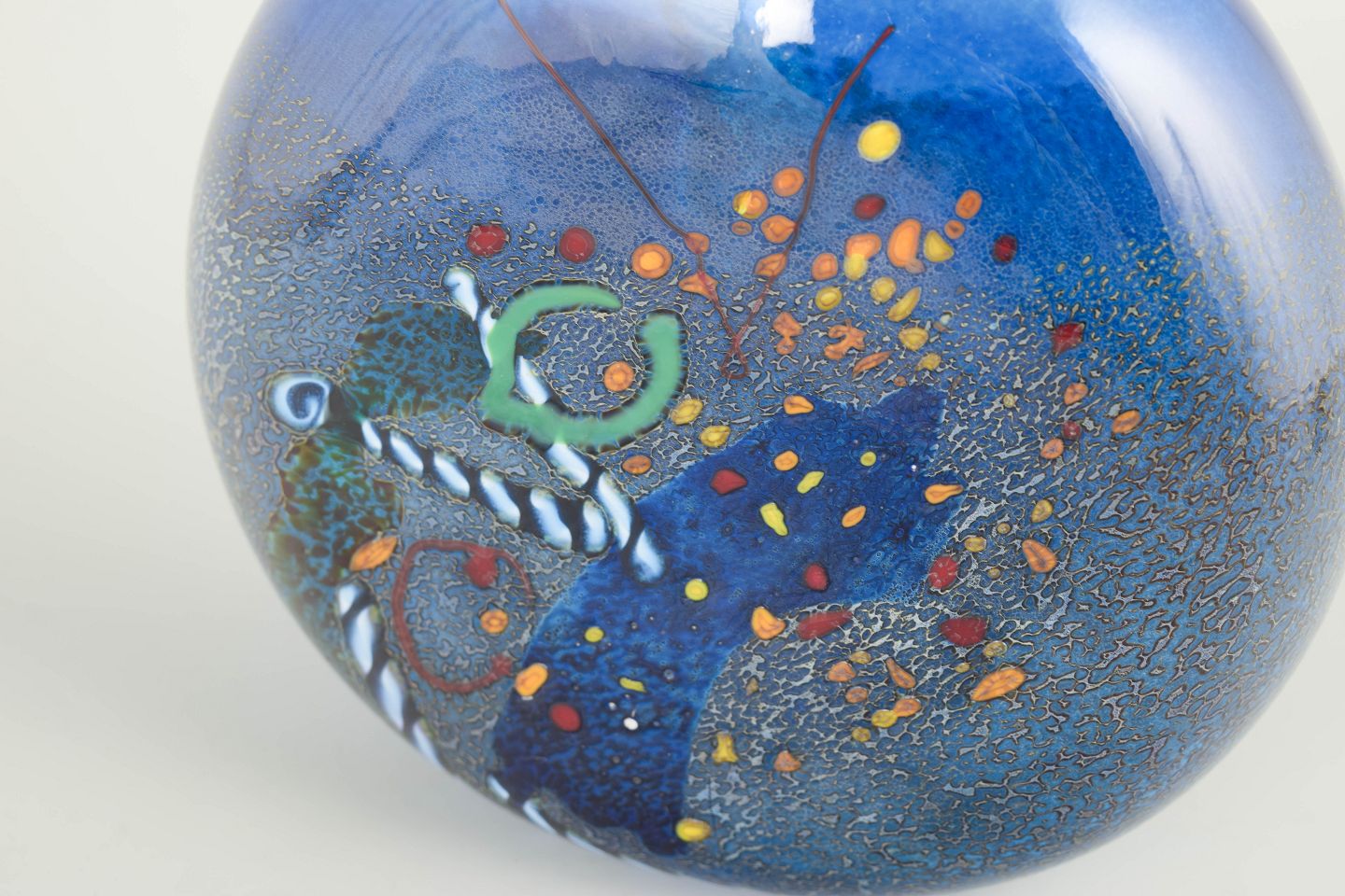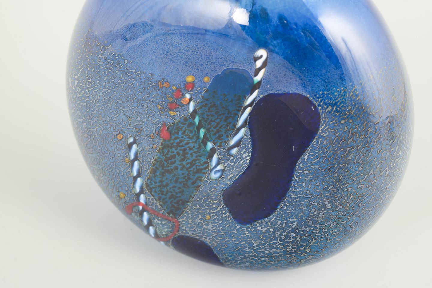 Organisk formet kunstglasvase i mundblæst blåligt glas med indsmeltede dekorative elementer og let krakeleret overfladestruktur. Modellenummer 40235 er indridset under bunden sammen med signatur.