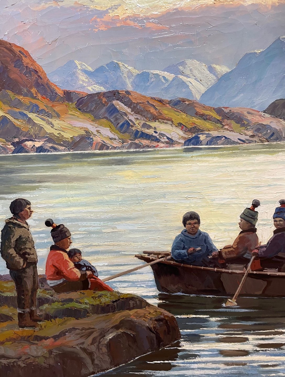 Stort flot maleri fra Grønland. Maleriet er monteret i forgyldt ramme. Maleriet har krakeleringer men ellers i god stand, er netop blevet renset hos konservator.