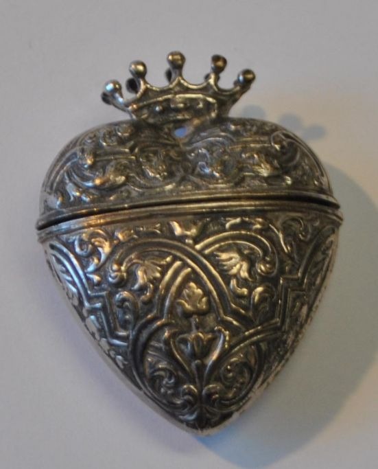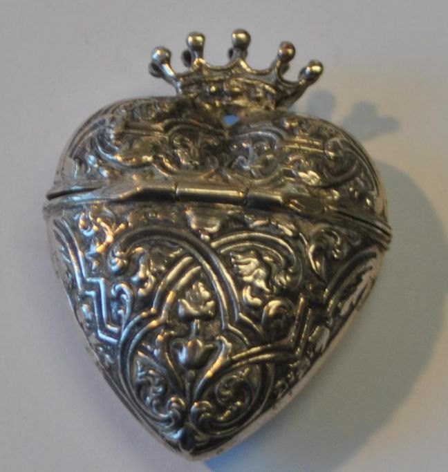 Hjerteformet hovedvandsæg i sølv med krone, 20. årh. Danmark. Stemplet: 830.H.: 4,5 cm. B.: 3,6 cm.