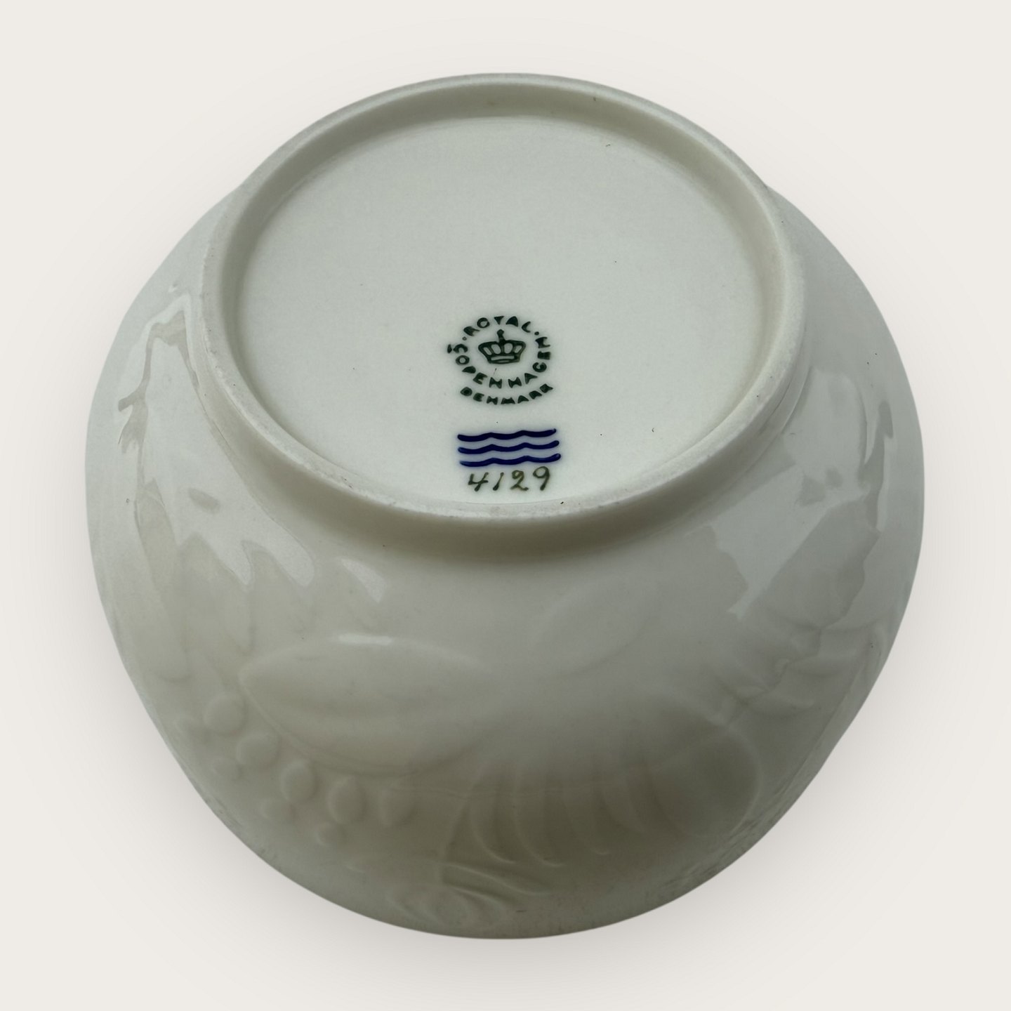 Royal Copenhagen, #4129, skål i blanc de chine med reliefmønster af bl.a. blomster og blade, diameter 15cm, højde 9cm *Pæn stand*