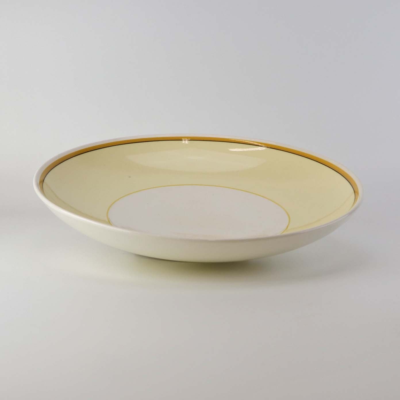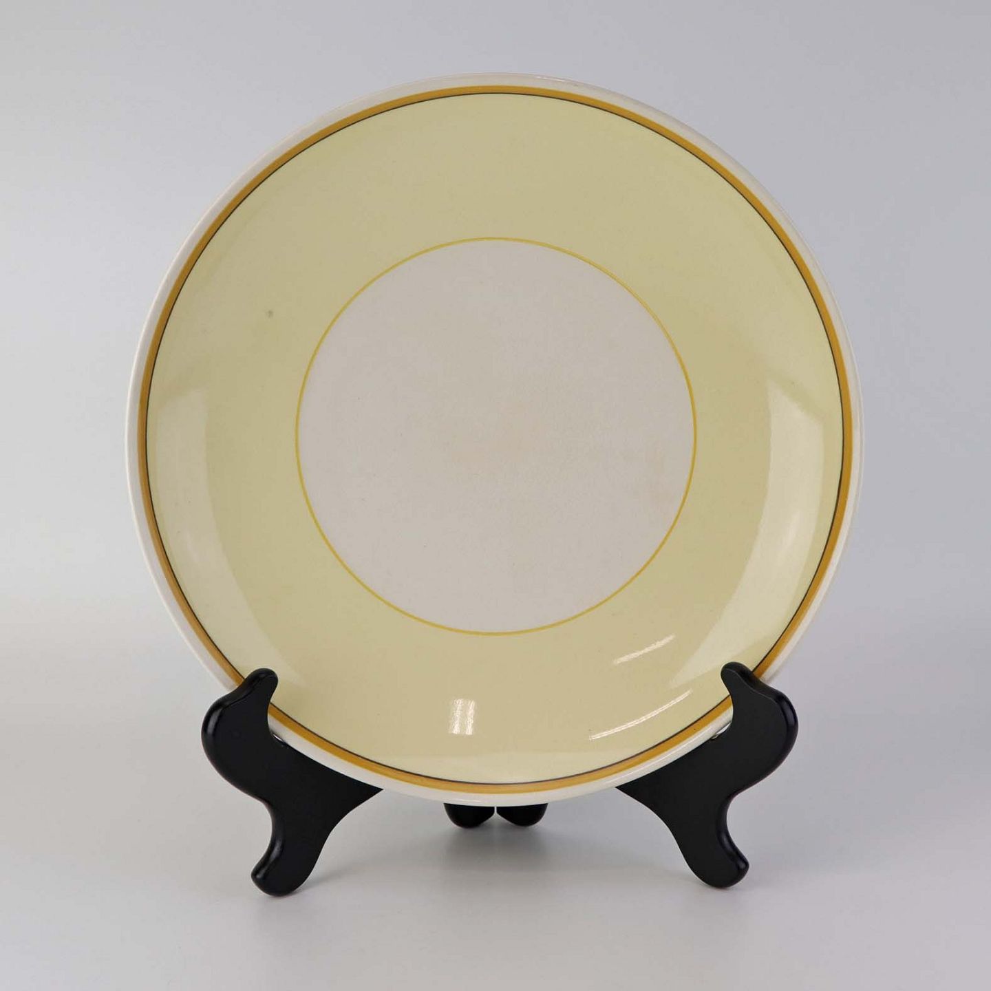 Glat fajancestel med dekoration i brune og gule farver på lys bagggrund med mørkebrun streg.