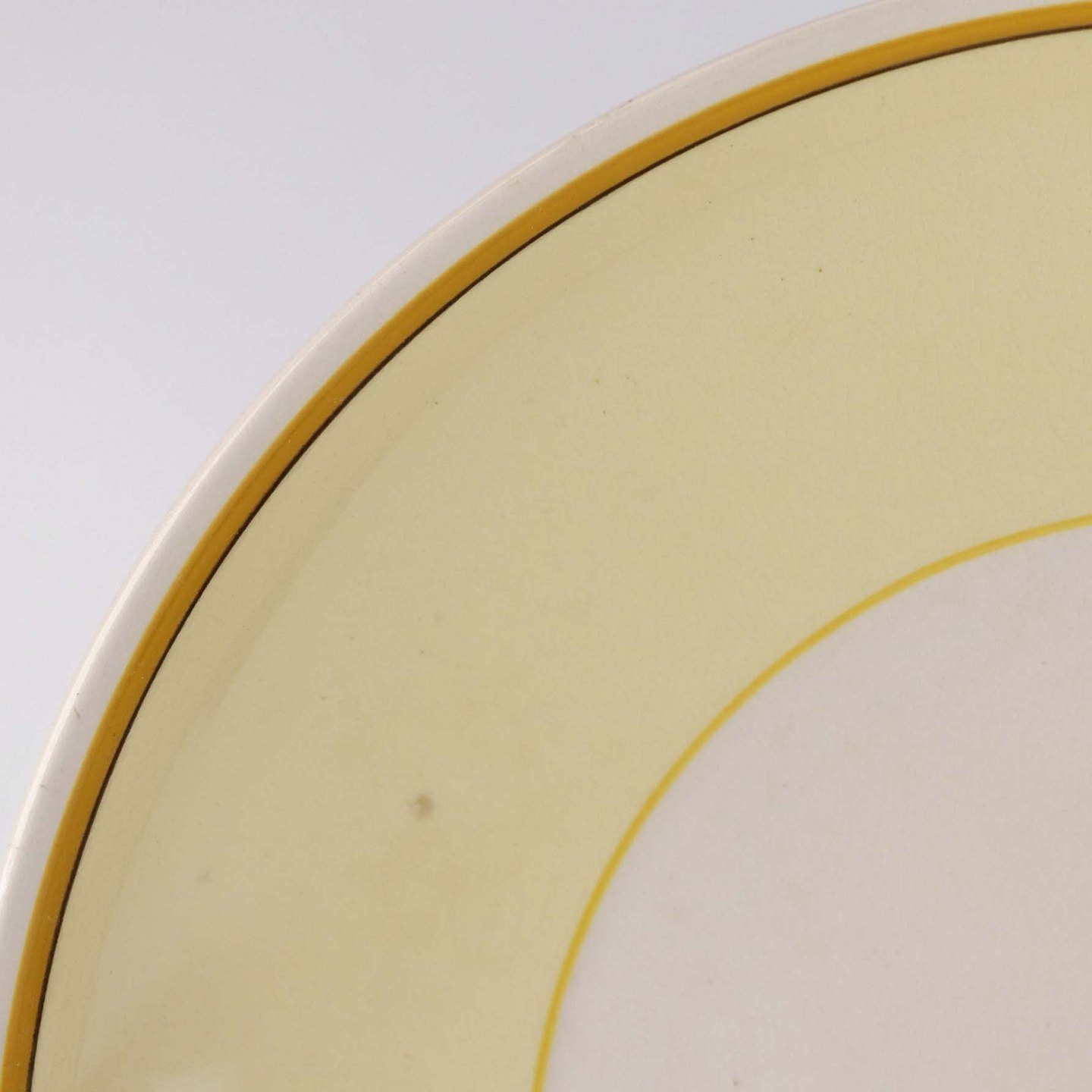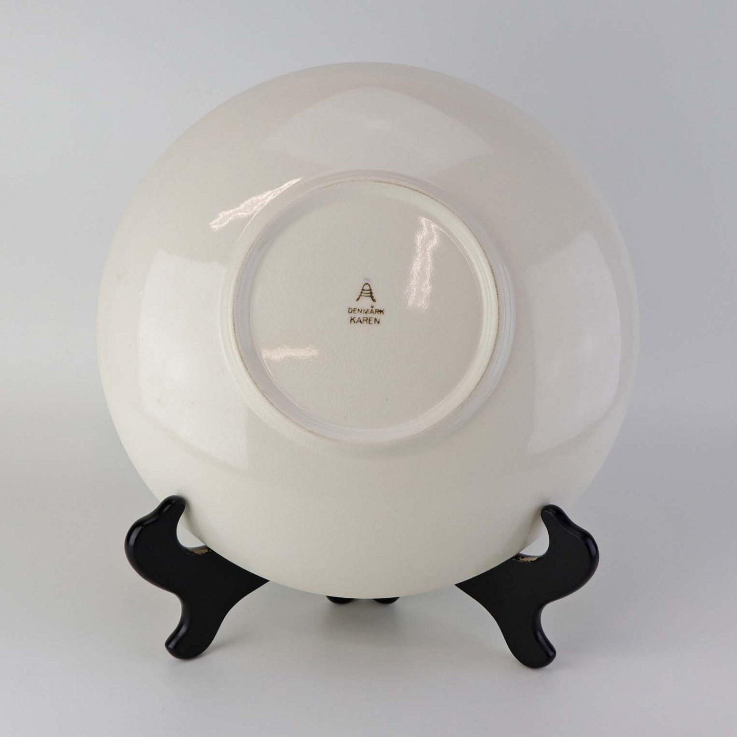 Fremstår med mørkning under glasuren på tallerkens frontside samt krakkeleringer i glasuren.