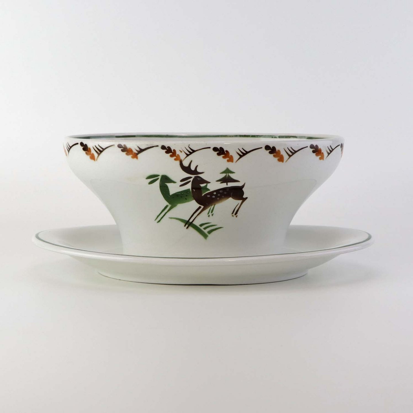Fajancestel i stelform C med dekoration af grøn og brun hjort på lys baggrund med kantbort af blade i brune nuancer.