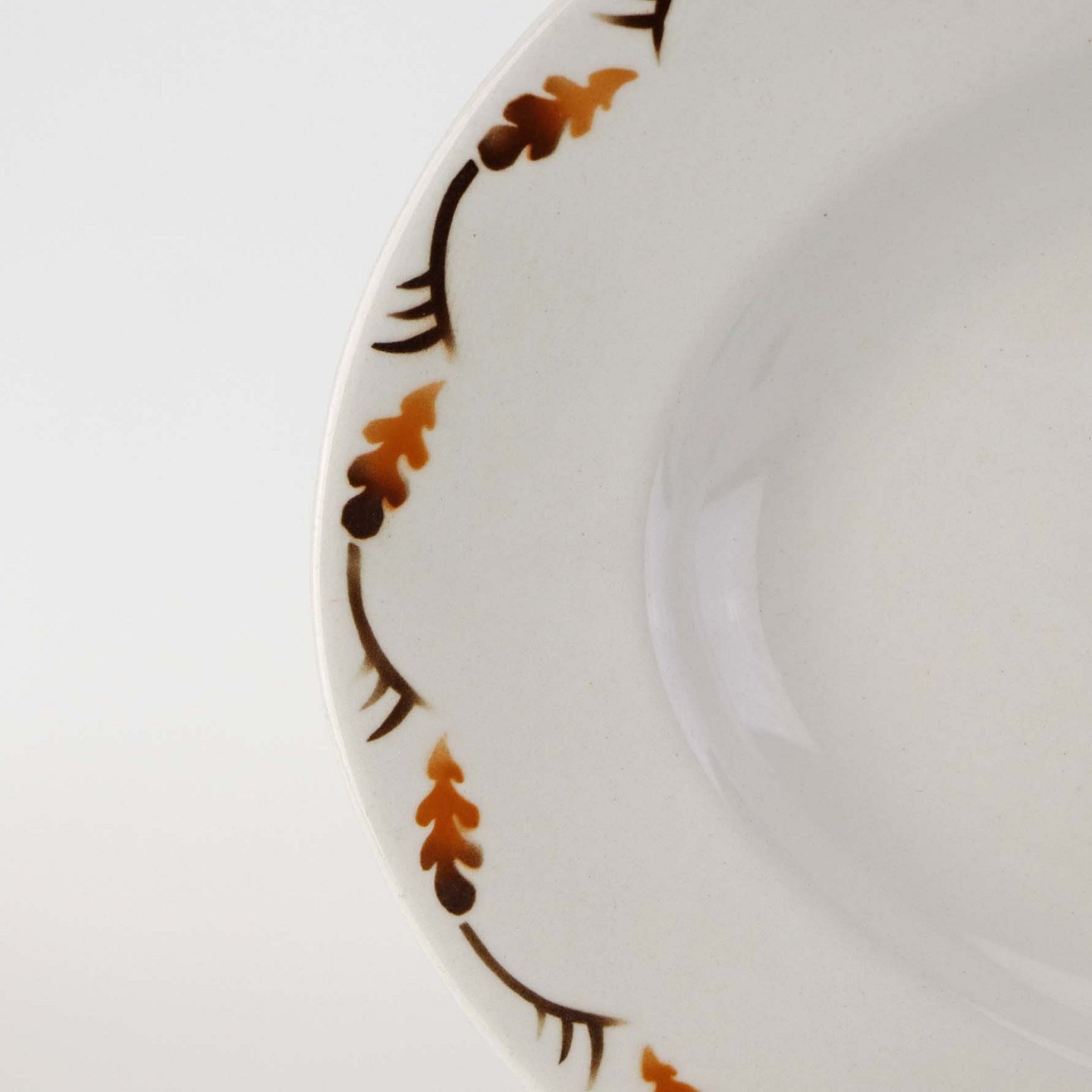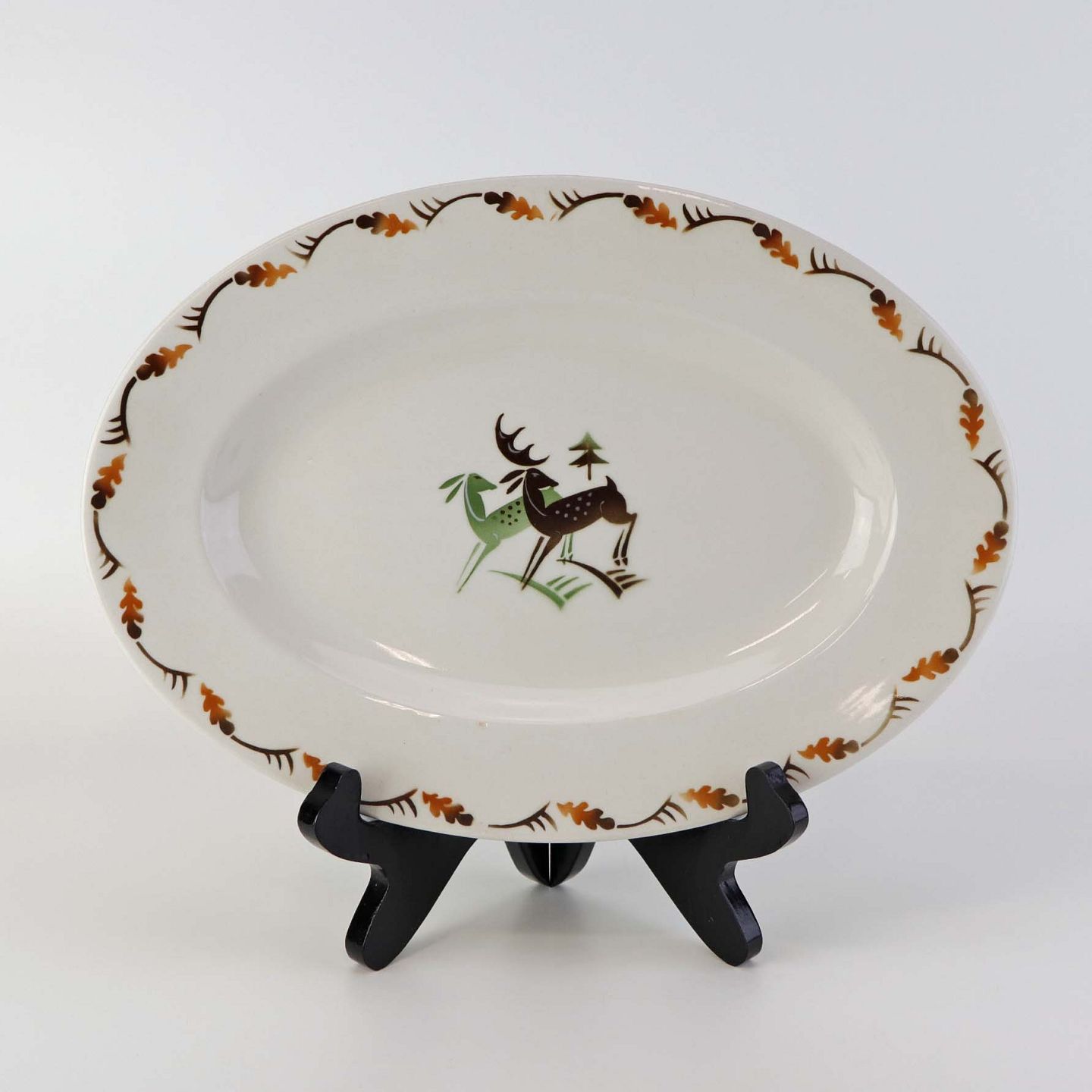 Fajancestel i stelform C med dekoration af grøn og brun hjort på lys baggrund med kantbort af blade i brune nuancer.