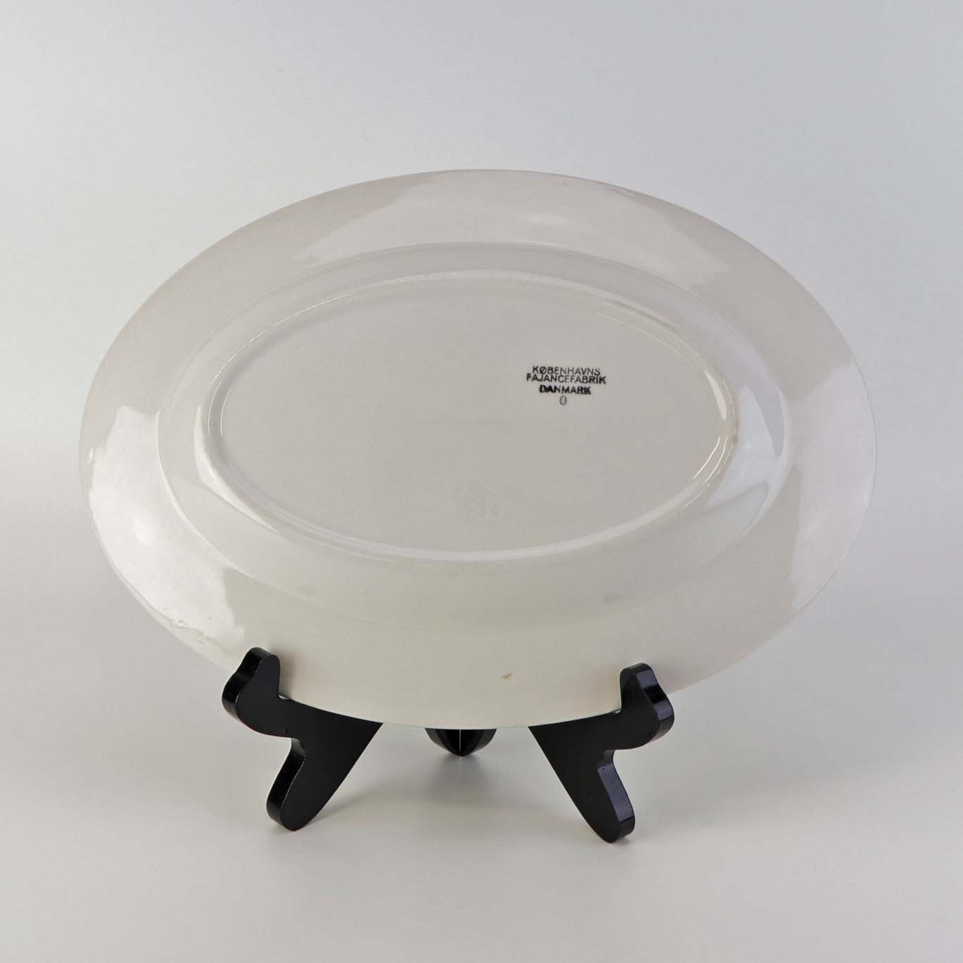 Lille ovalt fad i fajance fra Hjortestellet Convolvolus, som blev fremstillet i perioden 1930-1940