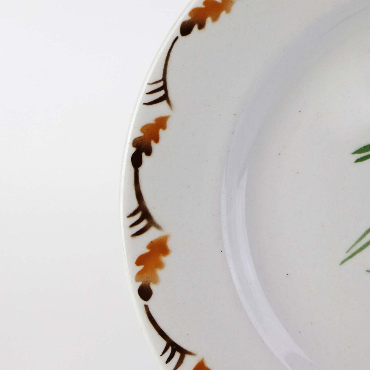 Fajancestel i stelform C med dekoration af grøn og brun hjort på lys baggrund med kantbort af blade i brune nuancer.