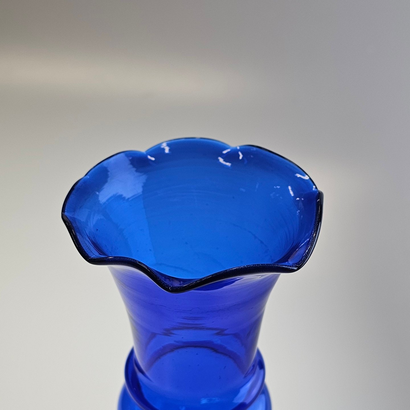 Håndblæst hyacintvase i blåt glas med buet kant