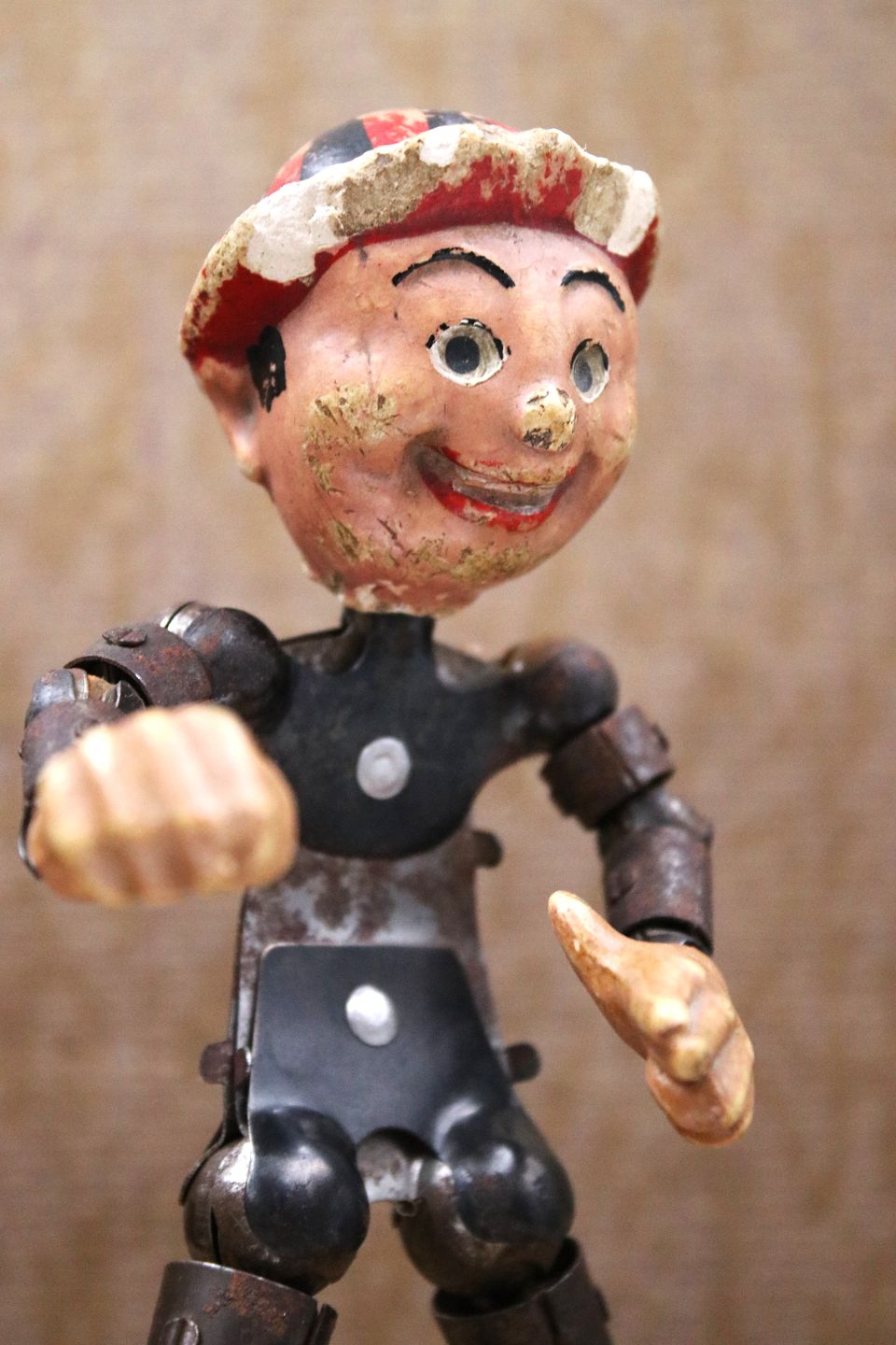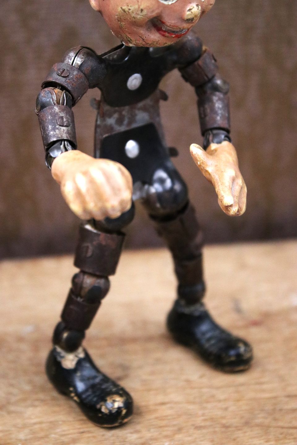 Krop , arme og ben er i metal som kan bøjes , hoved og hænder er i bemalet gips ( har lidt afslag ) Højde: 16,5cm.