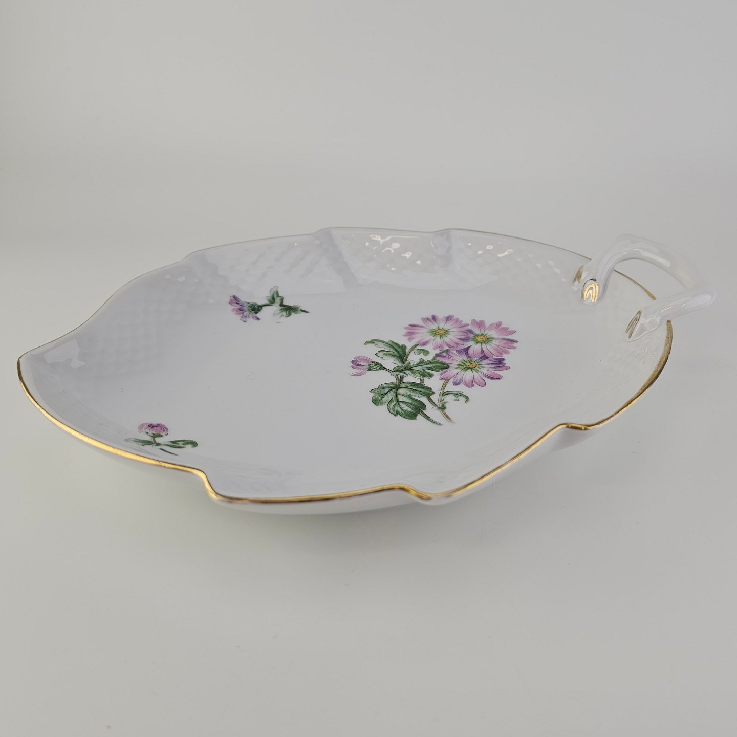 Krysantemum er hvidt porcelæn dekoreret med lys lilla blomst, grønne blade og guldkant.