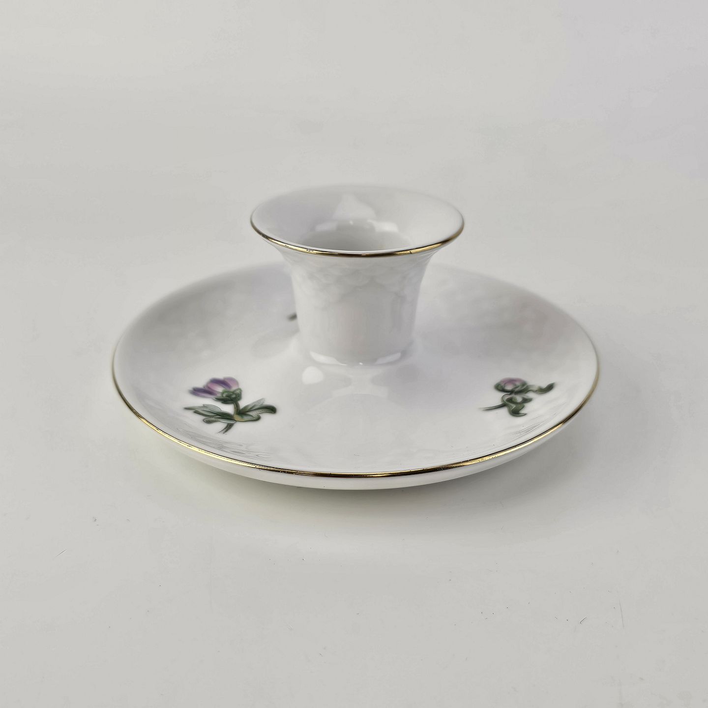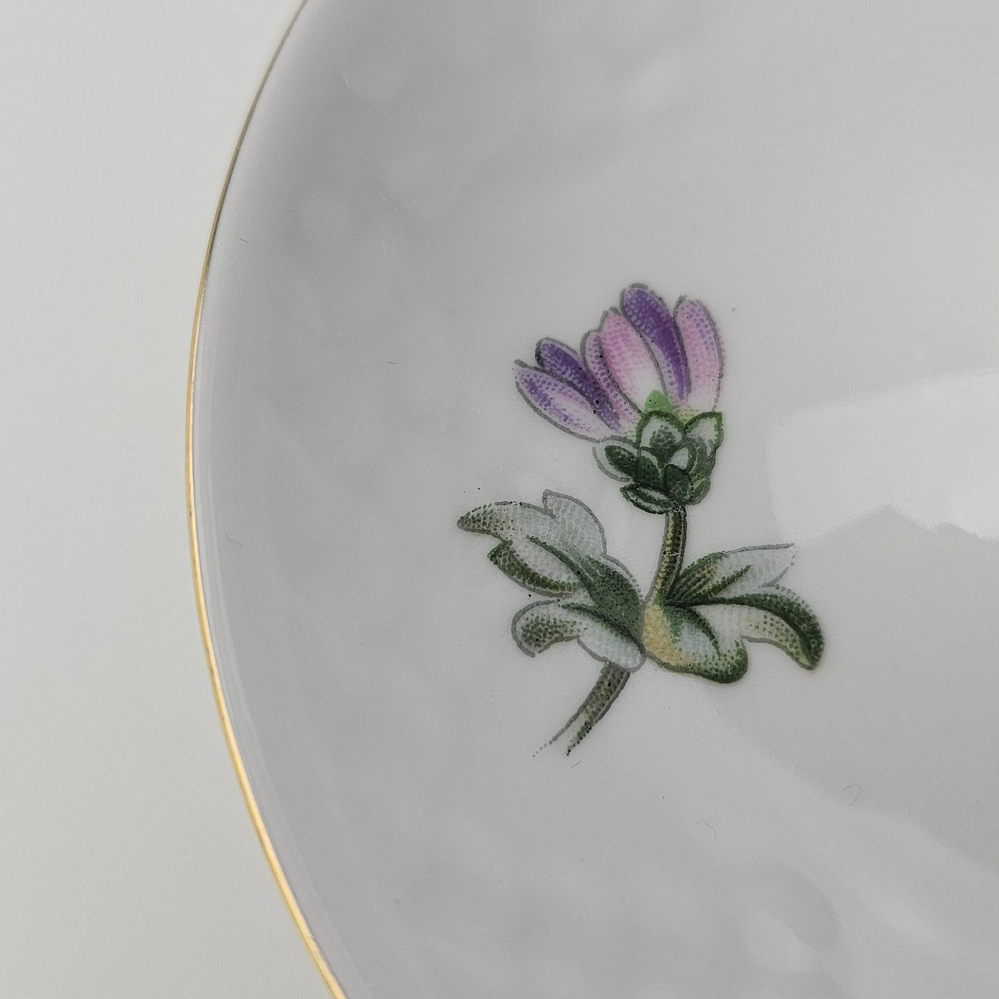 Krysantemum er hvidt porcelæn dekoreret med lys lilla blomst, grønne blade og guldkant.