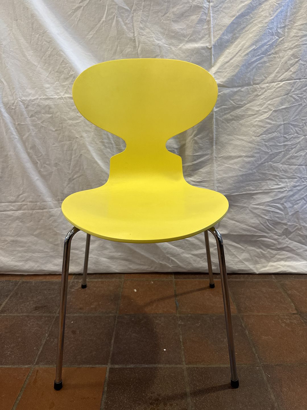 Arne Jacobsen Myrestol gul malet stel i forkromet metal.
