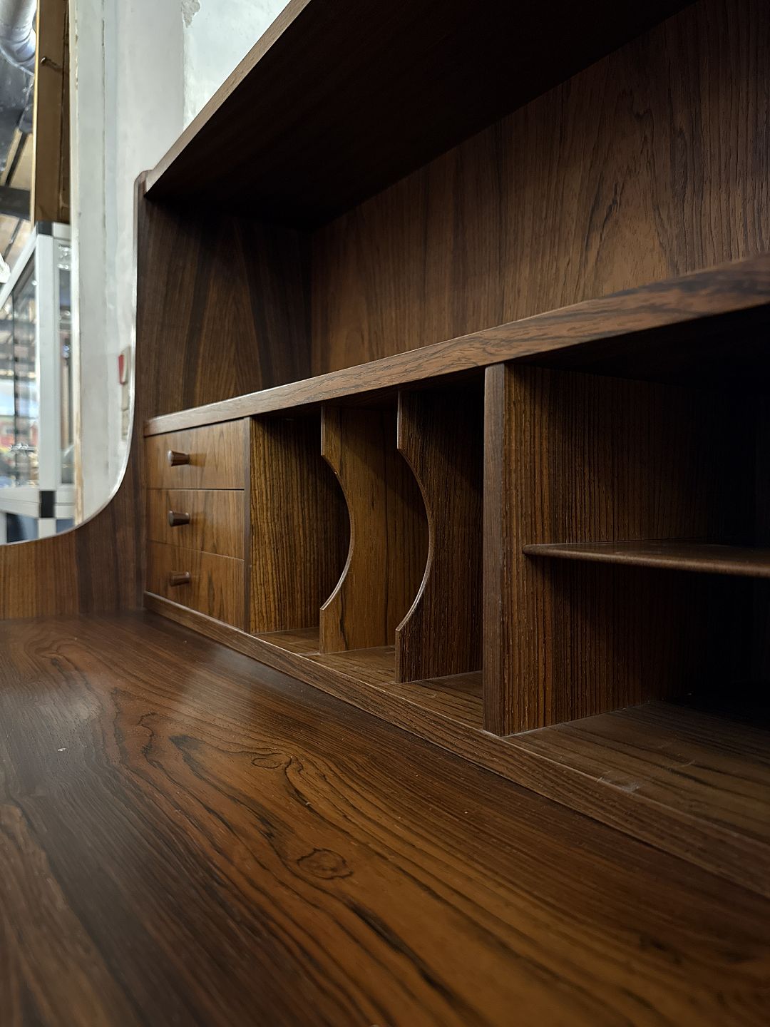 Fremstår i pæn brugt stand, mindre finerskade på bagsiden.
