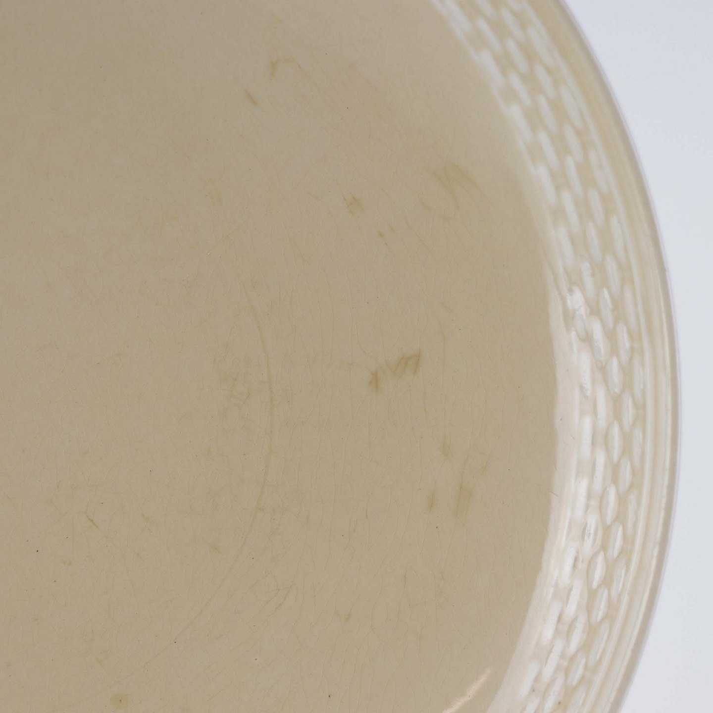 Fremstår med bruneringer under glasuren, krakkeleringer i glasuren og ujævnheder i glasurfarven på bagsiden.