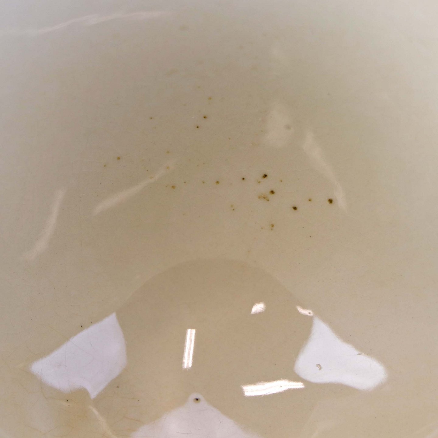 Fremstår med bruneringer under glasuren, krakkeleringer og ujævnheder i glasuren samt brugsspor langs topkanten.