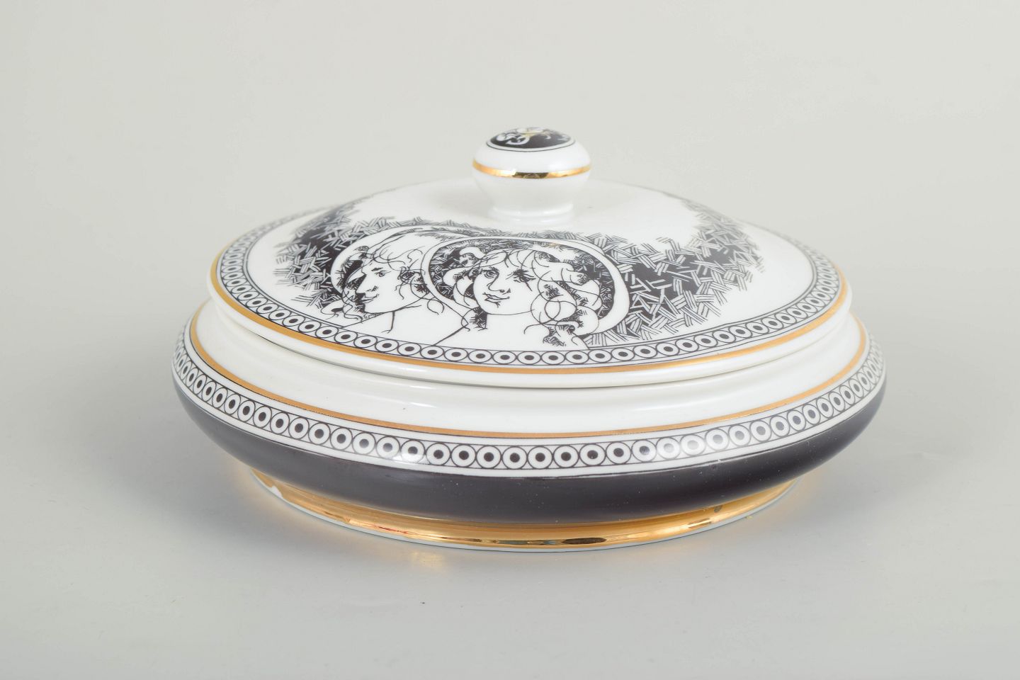 Rund skål med låg i hvidglaseret porcelæn med sort dekorationsbort og figurmotiv på låget. Fremstillet hos Hollóháza Porcelænsmanufaktur.