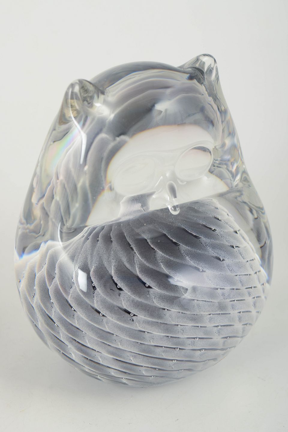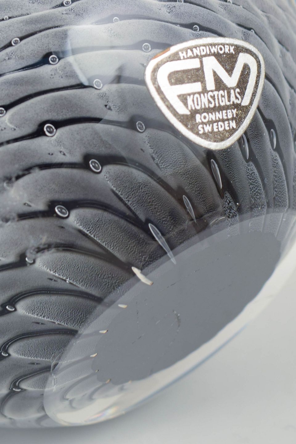 Dekorativ ugle i massivt kunstglas med klar overdel og indre mønster i grå og violette nuancer. Udført med spiralformet struktur i korpus og blødt modelleret hoved. Med originalt mærkat fra FM Konstglas, Ronneby.