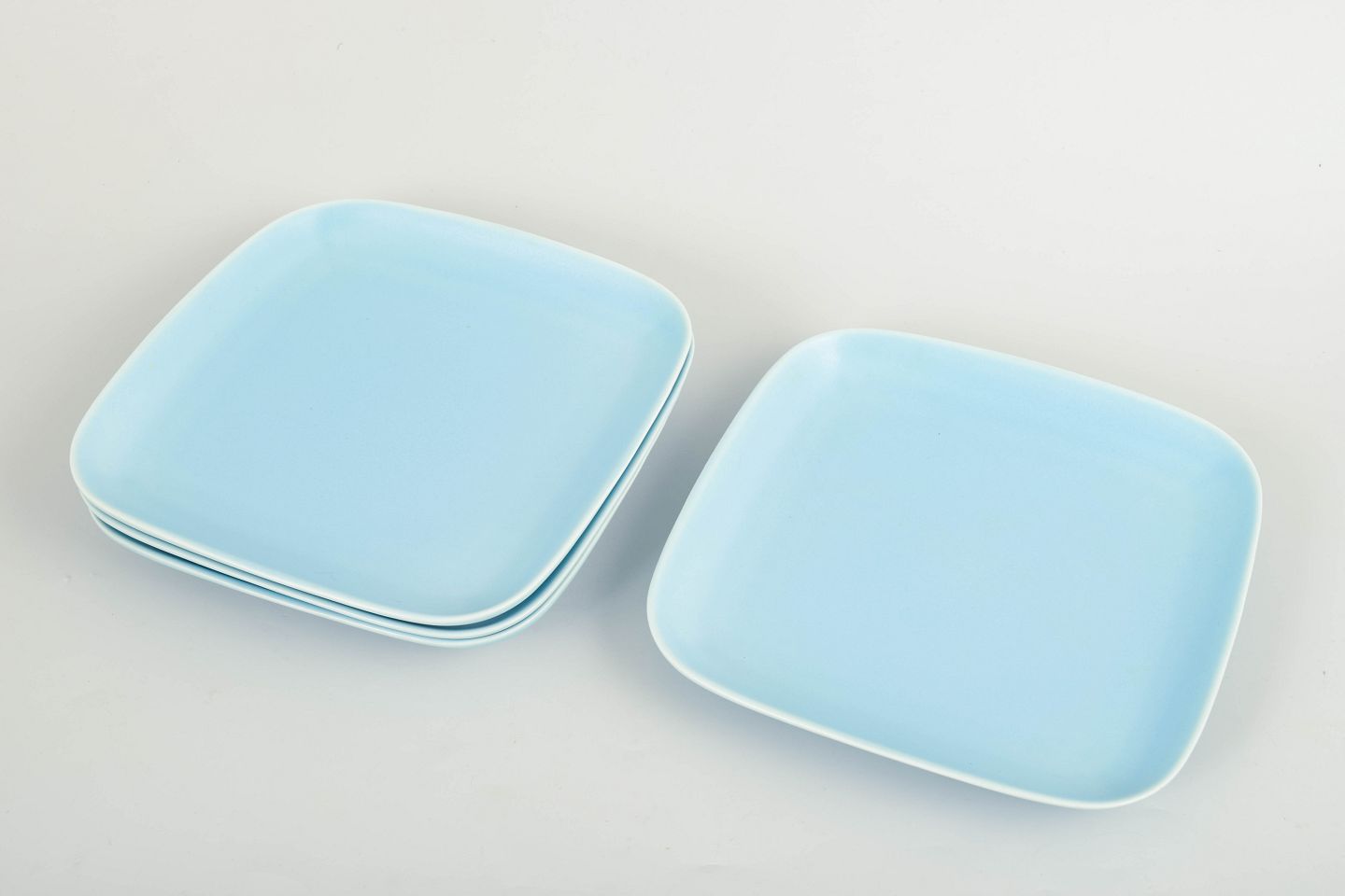 Höganäs Keramik, sæt af fire middagstallerkener i turkis glasur.