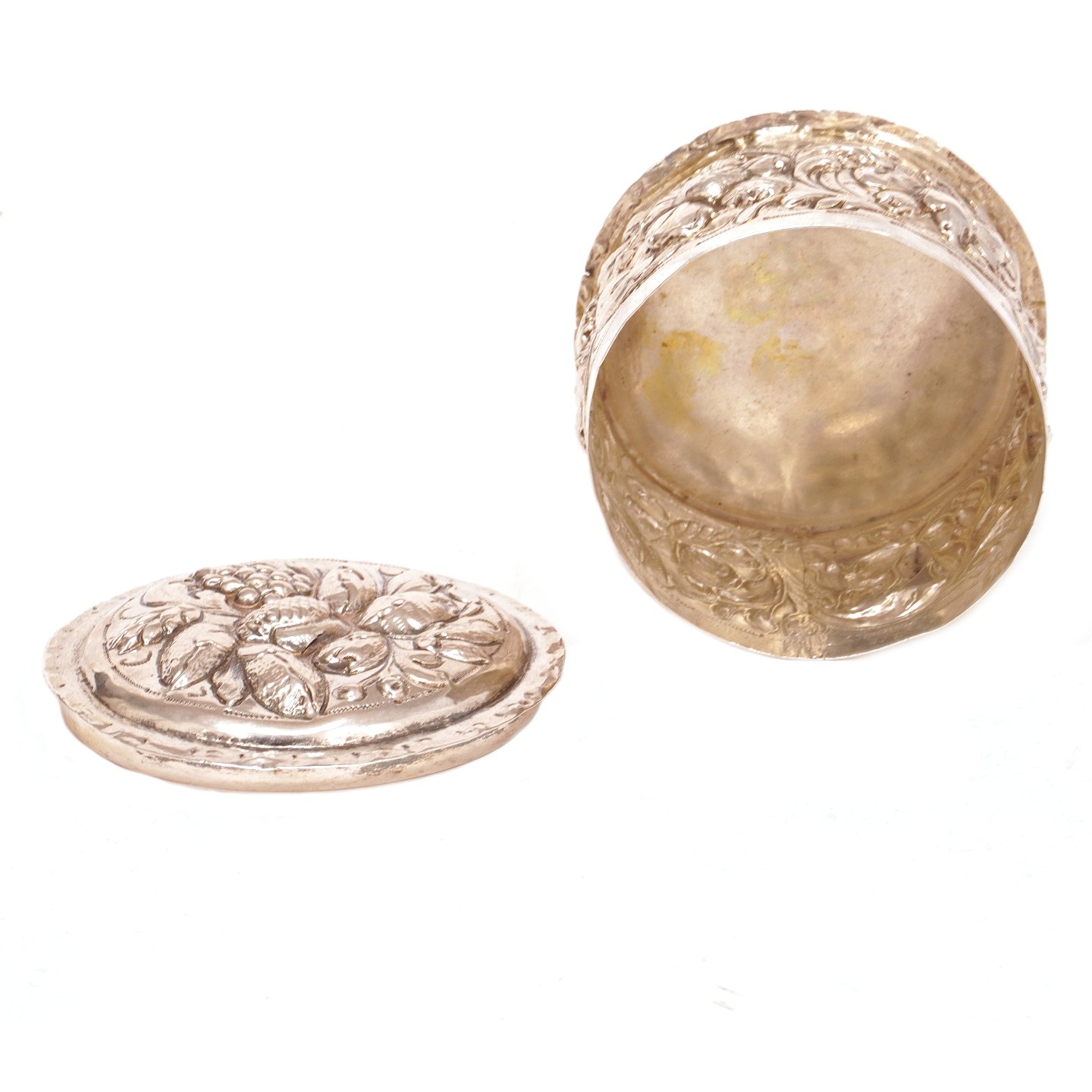 Drevet barok oblatdåse i sølv af Thore Sørensen, Aalborg, 1704-32. H: 6cm. D: 8,6cm