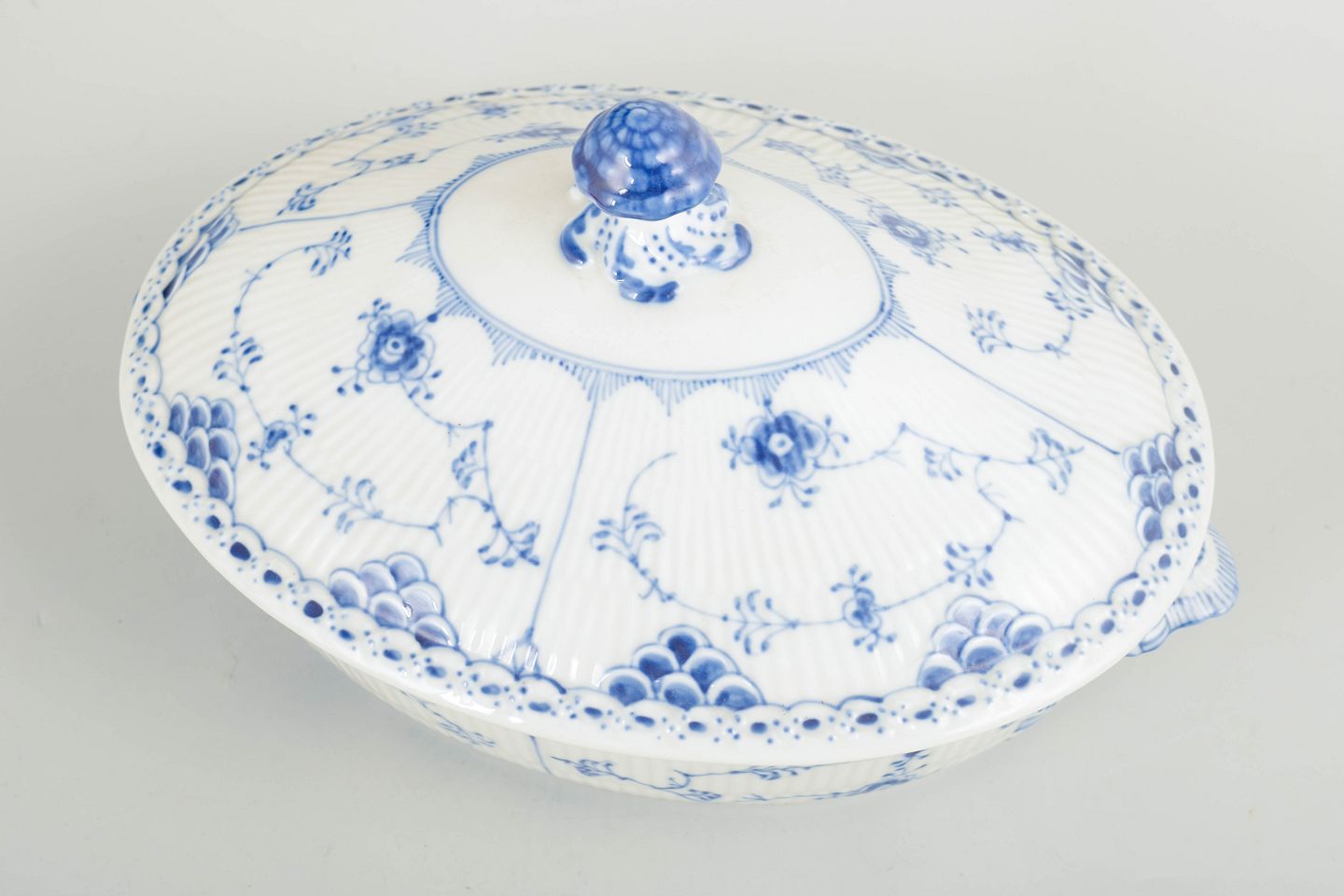 Terrin med låg i håndmalet porcelæn fra Musselmalet Halvblonde med klassisk underglasurdekoration i koboltblå, riflede felter og karakteristisk blondekant. Model 1/622. Første sortering. Fremstillet 1964.