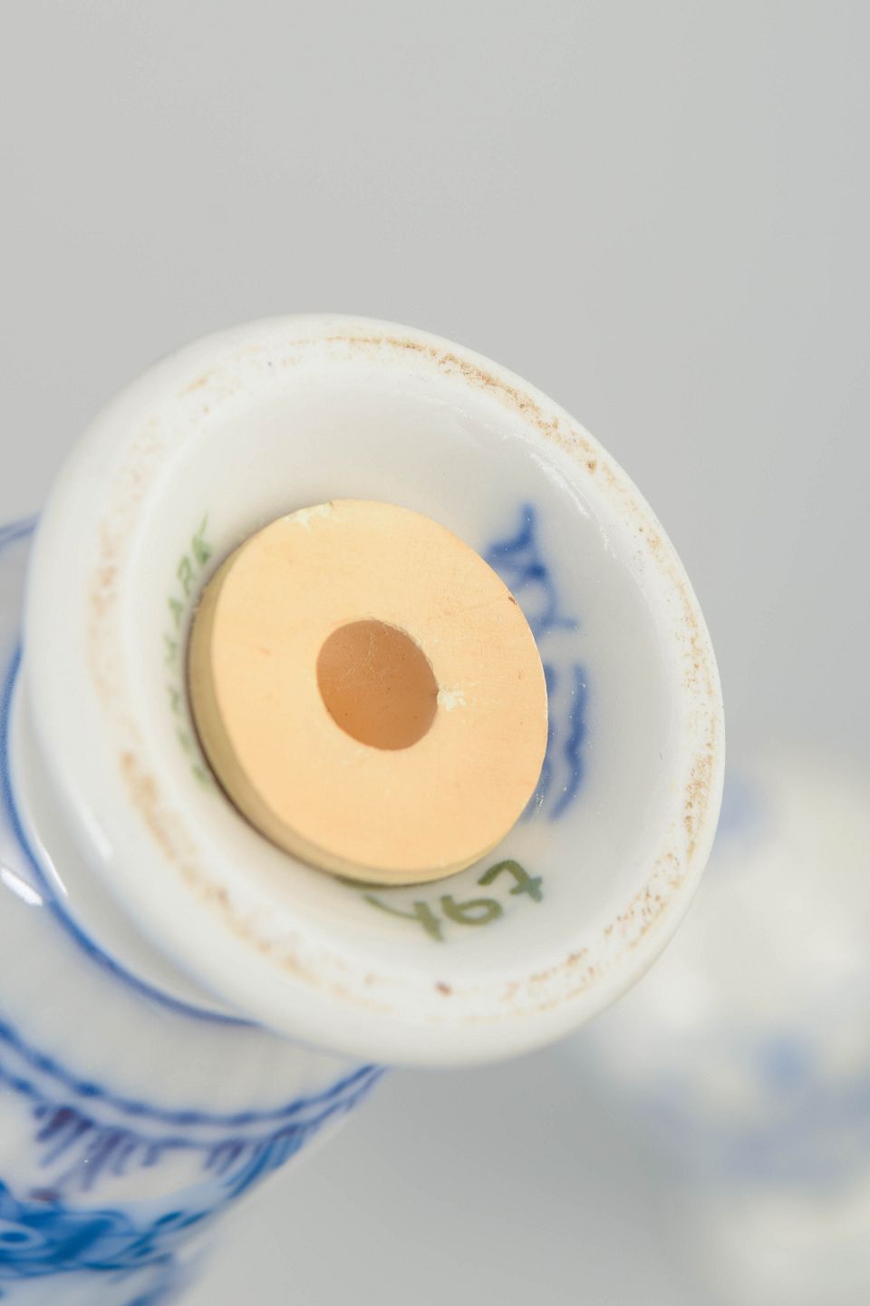 Salt- og pebersæt i håndmalet porcelæn fra Musselmalet Riflet med klassisk underglasurdekoration i koboltblå. Modeller 1/420 og 1/467. Første sortering. Fremstillet i 1920’erne.