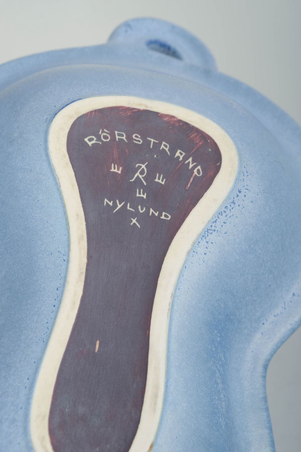 Organisk formet skål i stentøj med integreret hank og svungen, bladlignende form. Dekoreret med lys blå glasur med let struktur, typisk for Gunnar Nylunds formsprog hos Rörstrand i midten af det 20. århundrede. Første sortering.