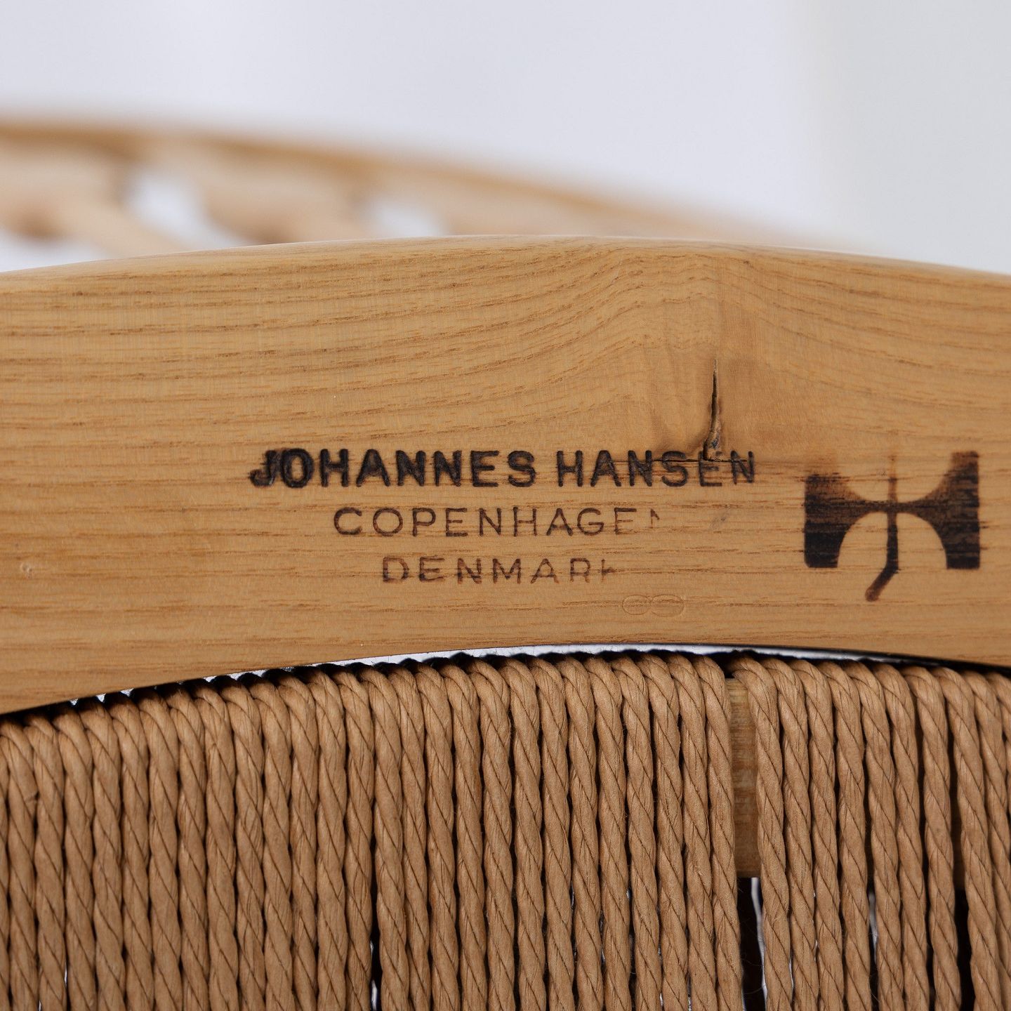 JH 550 - 'Påfuglestolen'-lænestol i patineret ask med armlæn i teak og sæde i flettet papirgarn. Brændemærket fra producent.
