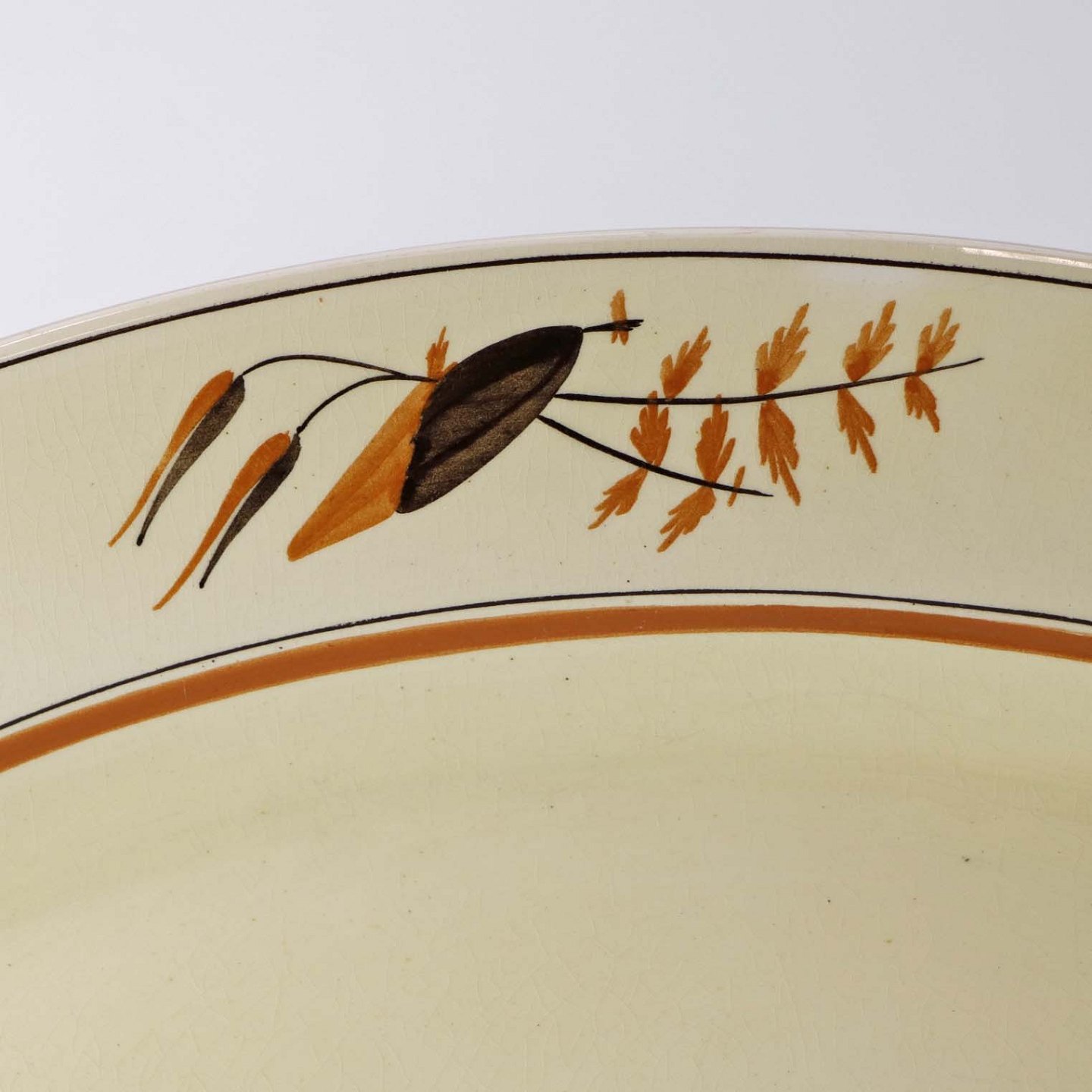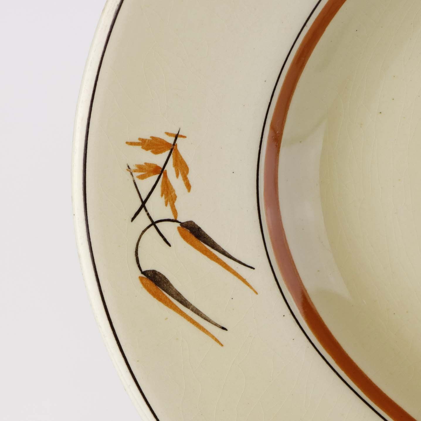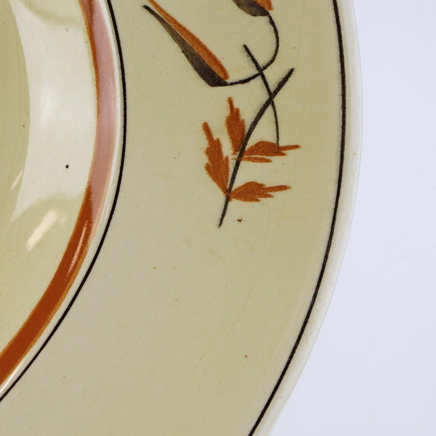Fajancestel i stelform E med dekoration af egetræsblade og kornaks i brun og orange farve på gul baggrund.